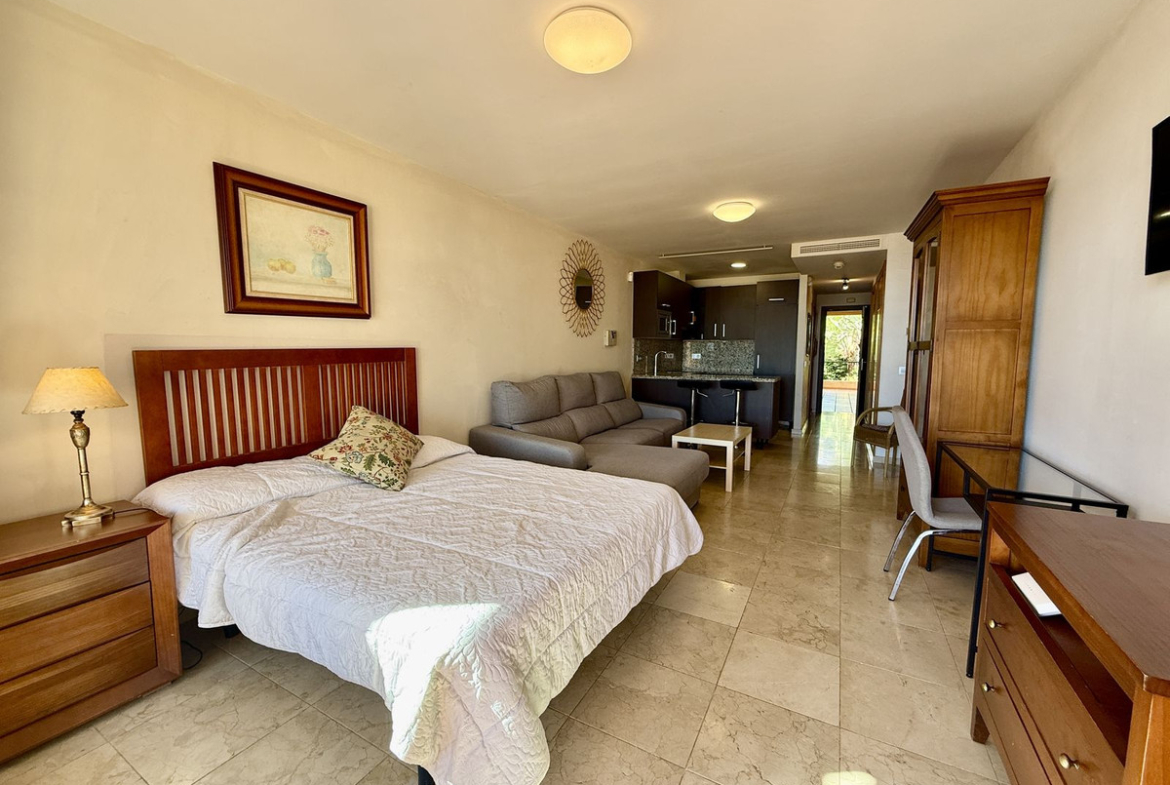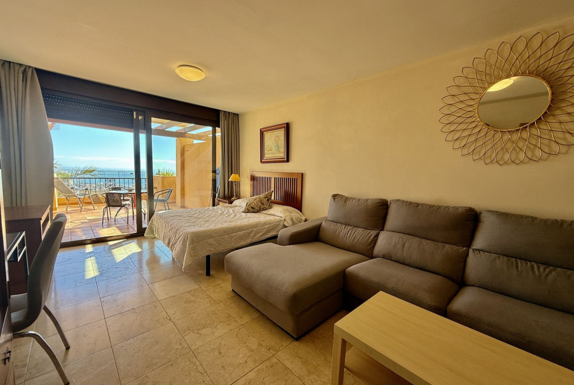 This 70-square-metre studio comprises a main room where it is possible to separate the bedroom area, the living-dining room and the kitchen. It has a spectacular south-facing terrace with sea views, and a parking space is included in the price.