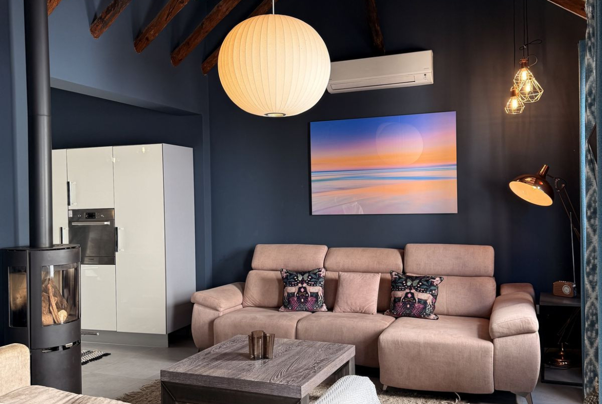 The apartment features an open living concept with dramatic double-height ceilings, original wood beams, and a cozy wood-burning stove. Every detail has been carefully considered in the stunning furnishings and decoration.