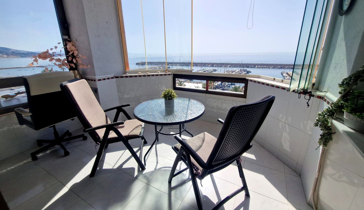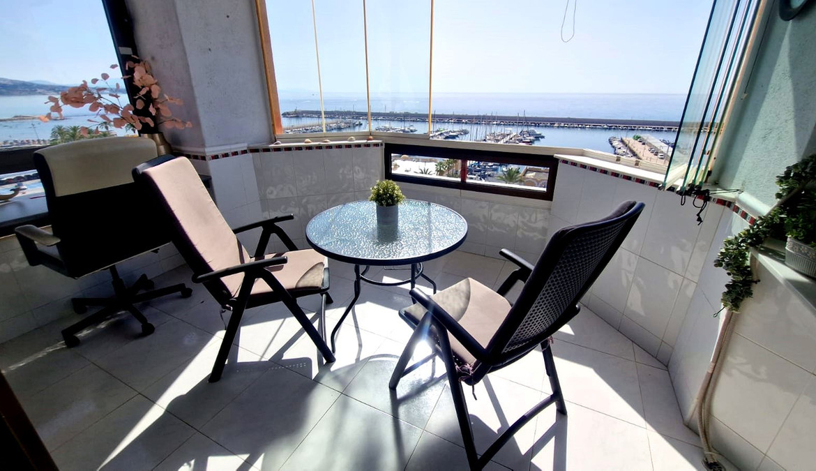 The property has a bedroom with fitted wardrobe and sea views, open plan modern fully equipped kitchen, and lounge dining with a sofa bed. The large terrace offers views to the marina, the coast and the mountains and has even a desk to work on line (if you can concentrate with the fantastic views!).