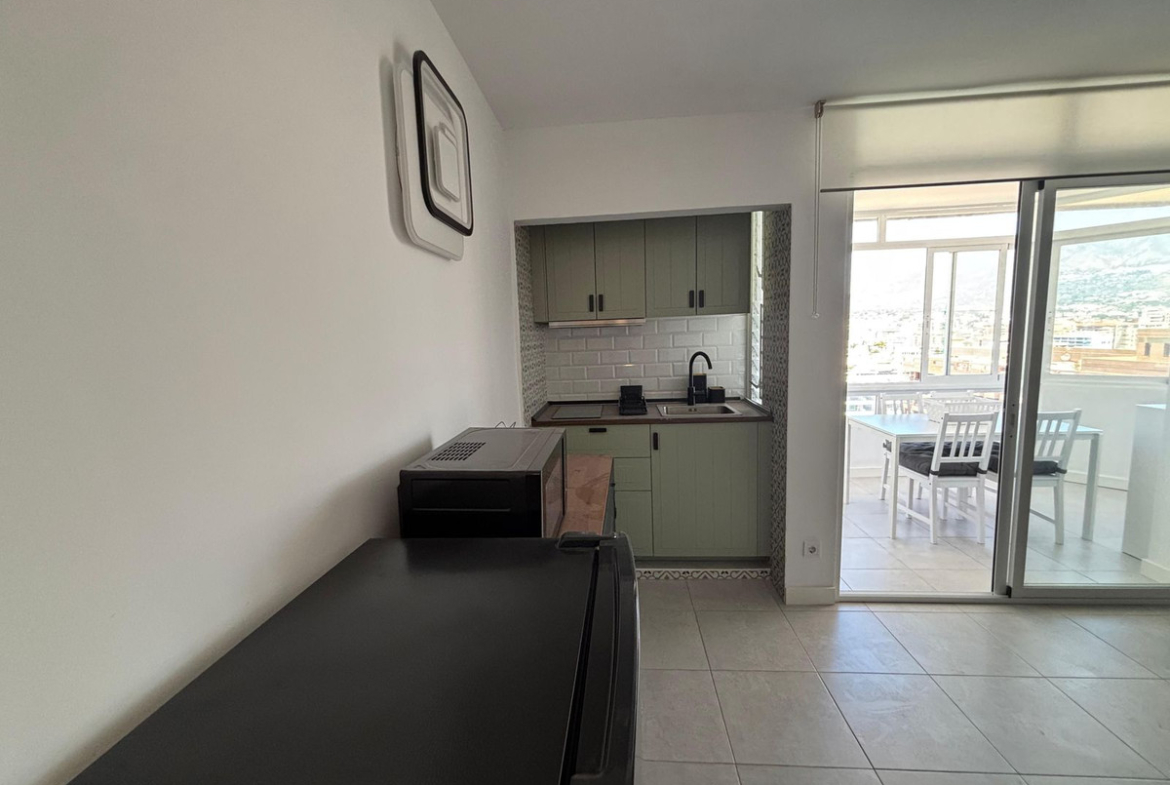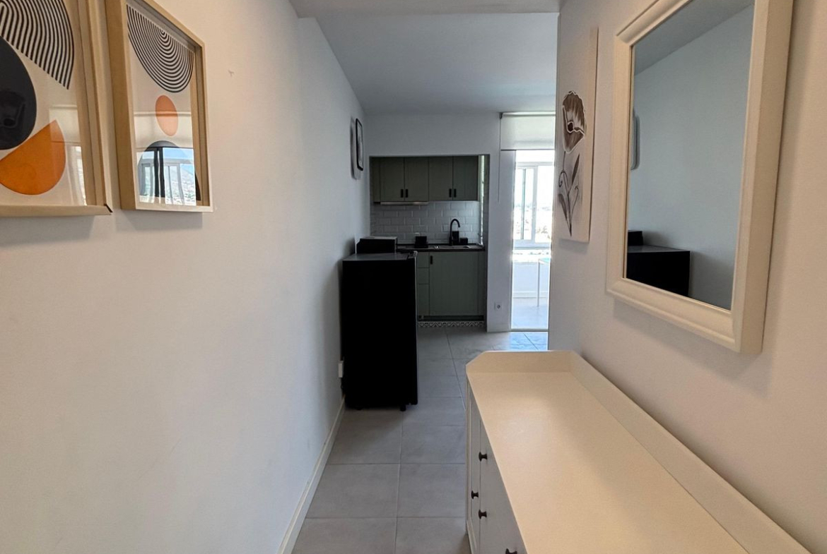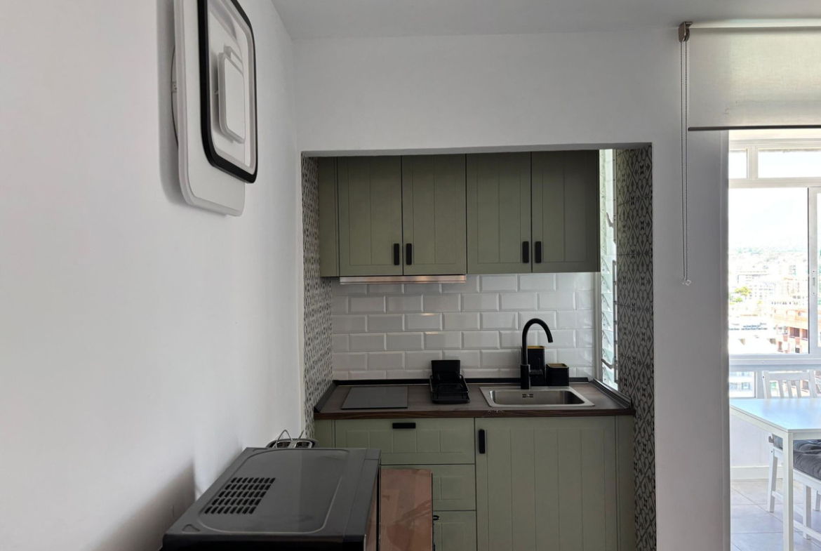 The living-dining area opens onto a private terrace with panoramic sea views. Functional kitchen, bright bedroom with built-in wardrobe, and a full bathroom. Well-maintained building with all essential services nearby: restaurants, supermarkets, public transport, and leisure options.