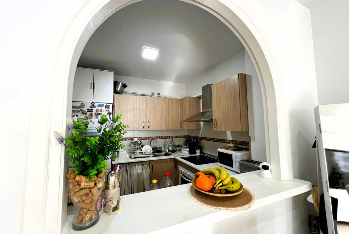 The apartment offers a spacious bedroom with direct access to the terrace, a full bathroom with shower, and a large living area with an open-plan kitchen. This main living space benefits from an excellent south-facing orientation, ensuring natural light throughout the day. The bespoke kitchen, finished with wooden cabinetry, provides a practical and comfortable space for everyday living.