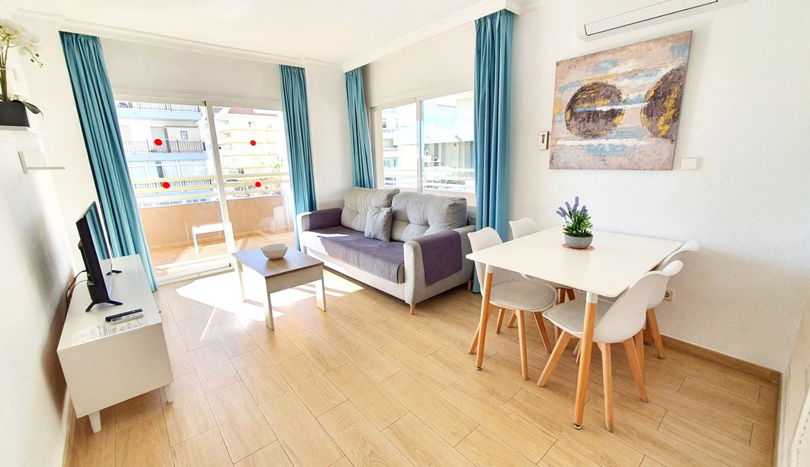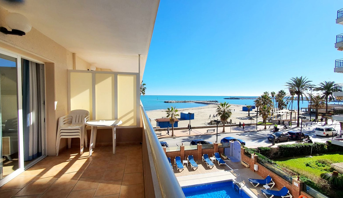 Front line apartment west facing with large wrap around terace. This property has been renovated and is set in a building with pool open all year. Ideal for holidays, the location is unbeatable close to ll amenities, transport, restaurants and supermarkets. The apartment stays furnished as seen.