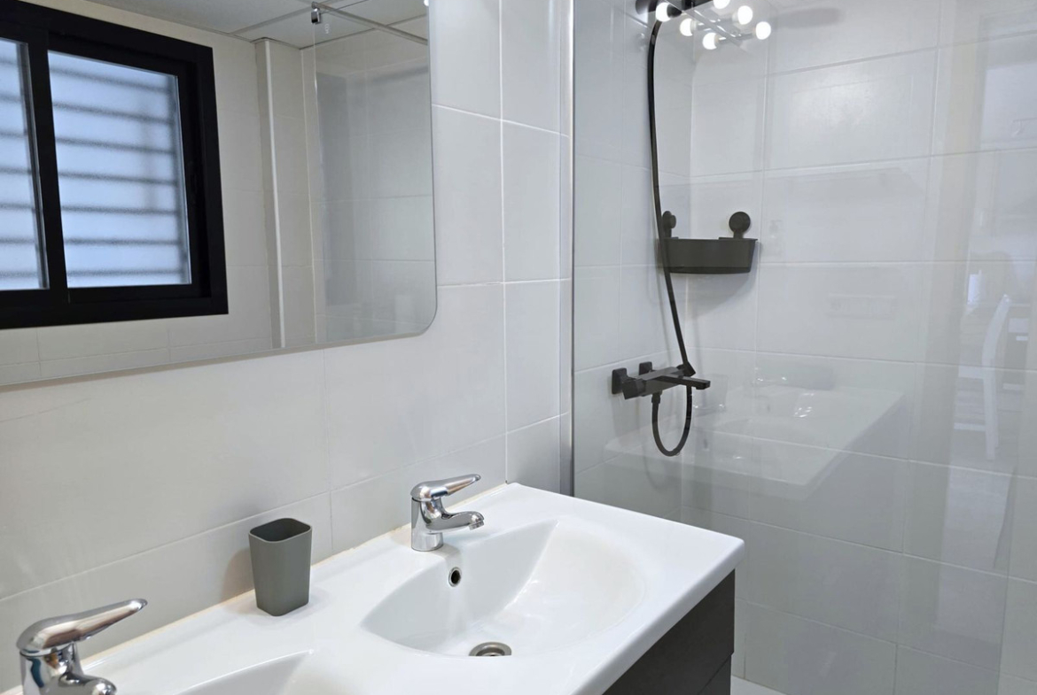 It is sold fully furnished, has a bathroom with a shower, central air conditioning, built-in wardrobes, covered garage and storage room included in the price.