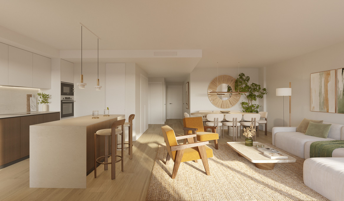 The project's common areas offer two swimming pools, a spa, a fully equipped gym and a coworking space with a kitchen to work and share ideas.