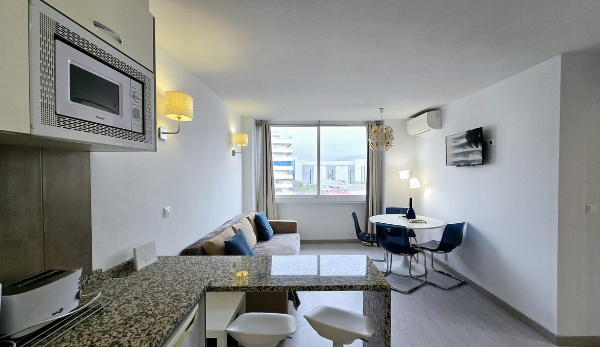 Flooded with natural light thanks to its large windows, the apartment boasts lovely urban and mountain views. Renovated just 7 years ago, the property features a contemporary open-plan kitchen, a spacious double bedroom with fitted wardrobes, and a sleek bathroom with a walk-in shower.
