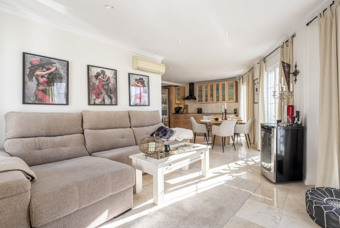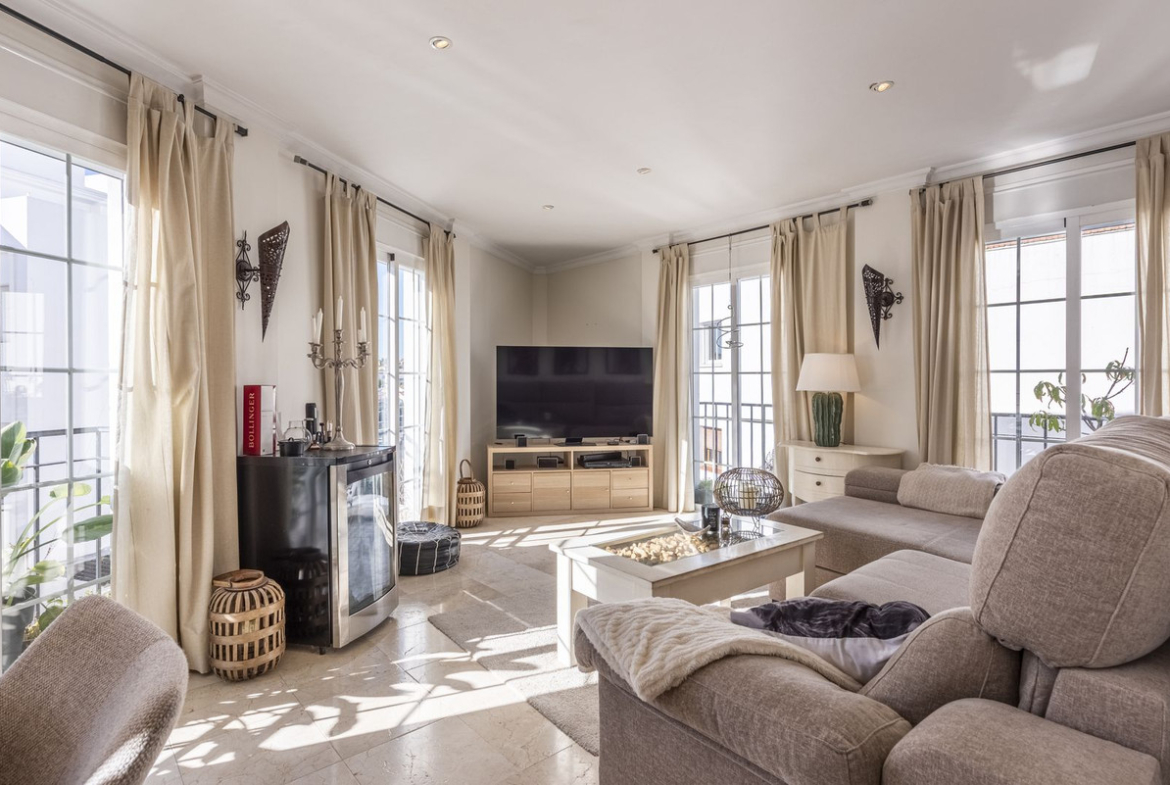 This unique duplex penthouse is located in the heart of San Pedro de Alcántara, where the town’s charm, vibrant atmosphere, and close proximity to restaurants, cafés, and shops meet a home filled with light and space. On the lower floor, daylight flows in through the floor-to-ceiling windows, creating a harmonious sense of openness. The open-plan layout seamlessly connects the kitchen, dining area, and living room, giving the home both a social and elegant character. Here you will also find a wonderful terrace that can be closed during the winter months, making it usable all year round — the perfect spot for relaxing mornings, dinners, or evenings overlooking the surrounding cityscape.
