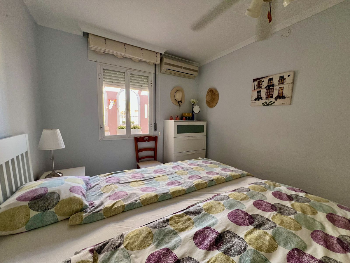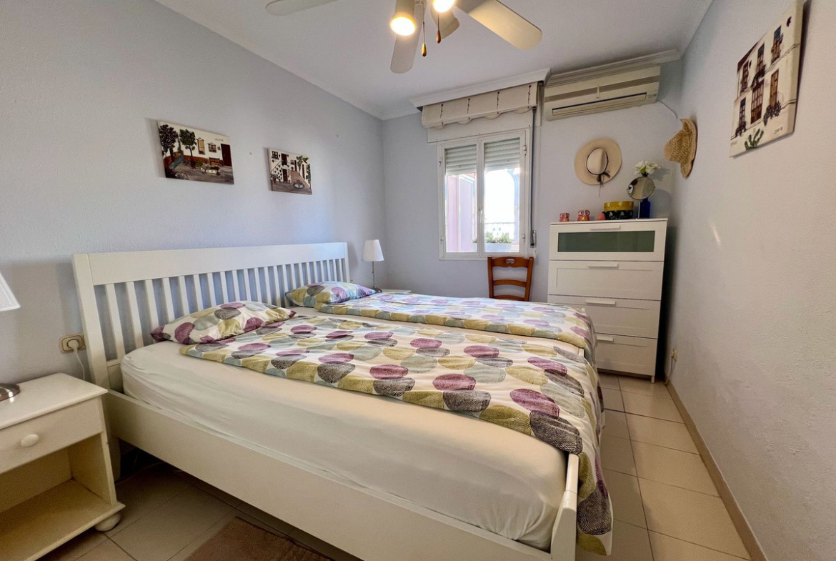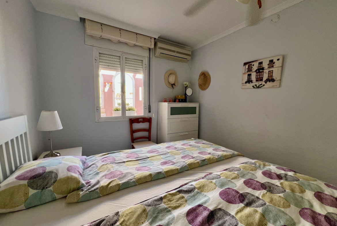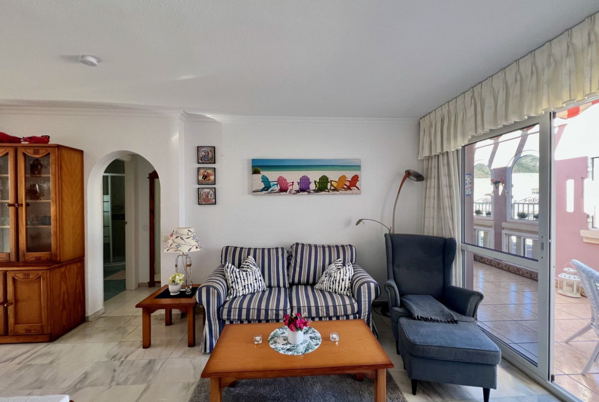 The layout includes a comfortable living and dining area, a compact kitchen, one bathroom, and a main bedroom. A section of the terrace has been enclosed and is currently used as a practical guest room, providing extra sleeping space or an ideal spot to work from home.