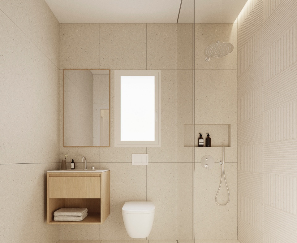 All apartments in the project include 2 fully equipped bathrooms and kitchens with upper and lower cabinets. Pre-installation for ducted air conditioning is included. Aluminium windows and balcony doors with thermal break; motorized blinds on the main façade. Built-in wardrobes with textile lining, drawers, and hanging rail. Large-format porcelain flooring and smooth white paint throughout the home.