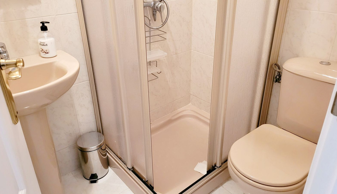 Upstairs, you will find a double bedroom currently arranged with twin beds, featuring access to a further private terrace. This floor also includes a full bathroom fitted with a bath and shower over.