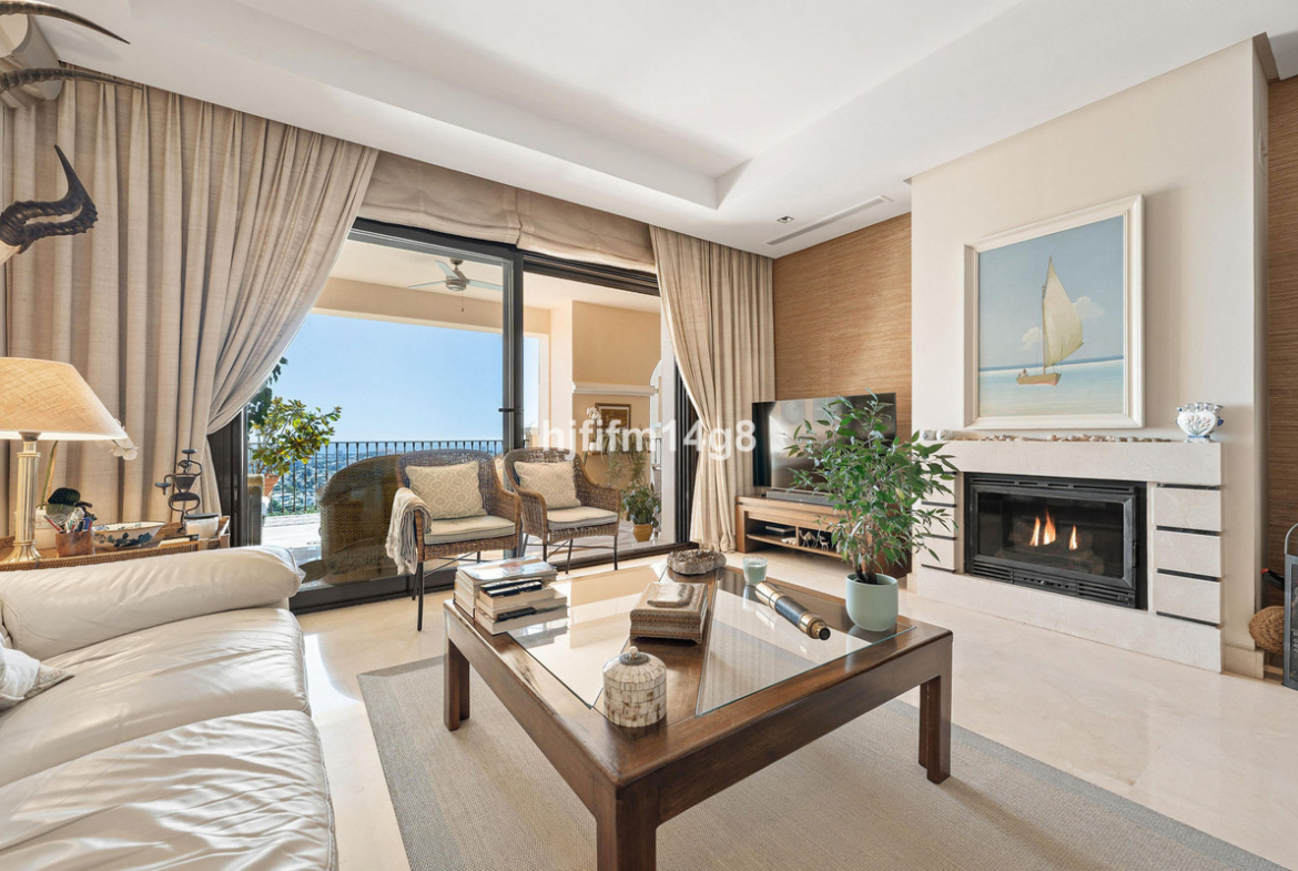The apartment itself is spacious, bright, and beautifully presented. The open-plan living and dining area includes a cozy fireplace and opens directly onto a covered terrace of 40sqm with panoramic views over the Mediterranean Sea, La Concha Mountain, the communal gardens, and the La Quinta Golf Course. The fully fitted kitchen includes a charming breakfast area and a separate utility room for added convenience. The property features two generous bedrooms and two modern bathrooms, both with walk-in showers and underfloor heating. The master bedroom enjoys direct access to the main terrace and an en-suite bathroom, while the second bedroom is equally comfortable and served by a separate bathroom.