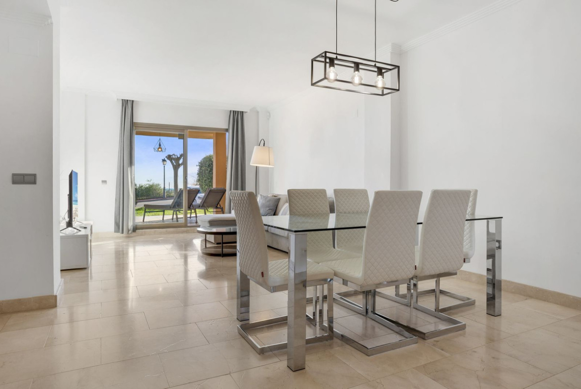 The apartment comprises two spacious bedrooms and two modern bathrooms and is presented to an immaculate standard. Designed for year-round comfort, the property benefits from underfloor heating throughout, while both the master bedroom and the lounge enjoy stunning sea views, creating a bright and relaxing living environment.