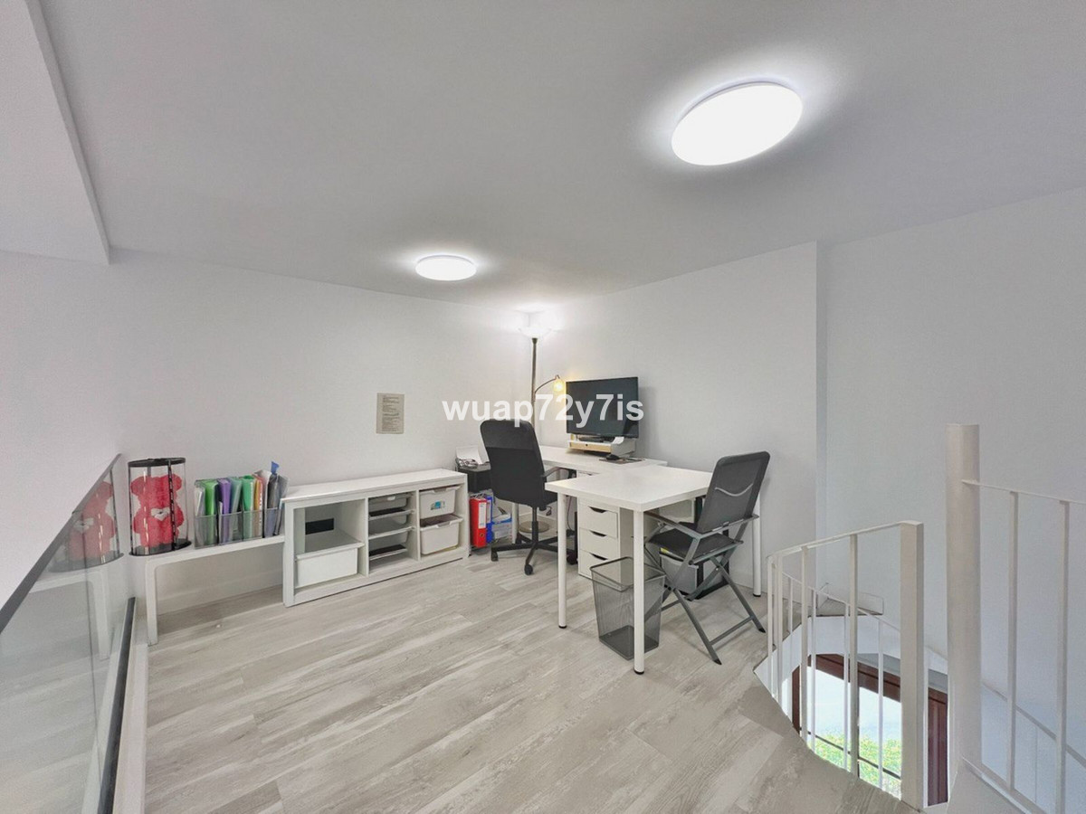 The spacious living room boasts double-height ceilings and an abundance of natural light, creating an airy and sophisticated atmosphere. For added convenience, a mezzanine level has been designed as a home office and library. From here, you step out onto the first level of the terrace, an inviting spot for morning coffee or an evening glass of wine.