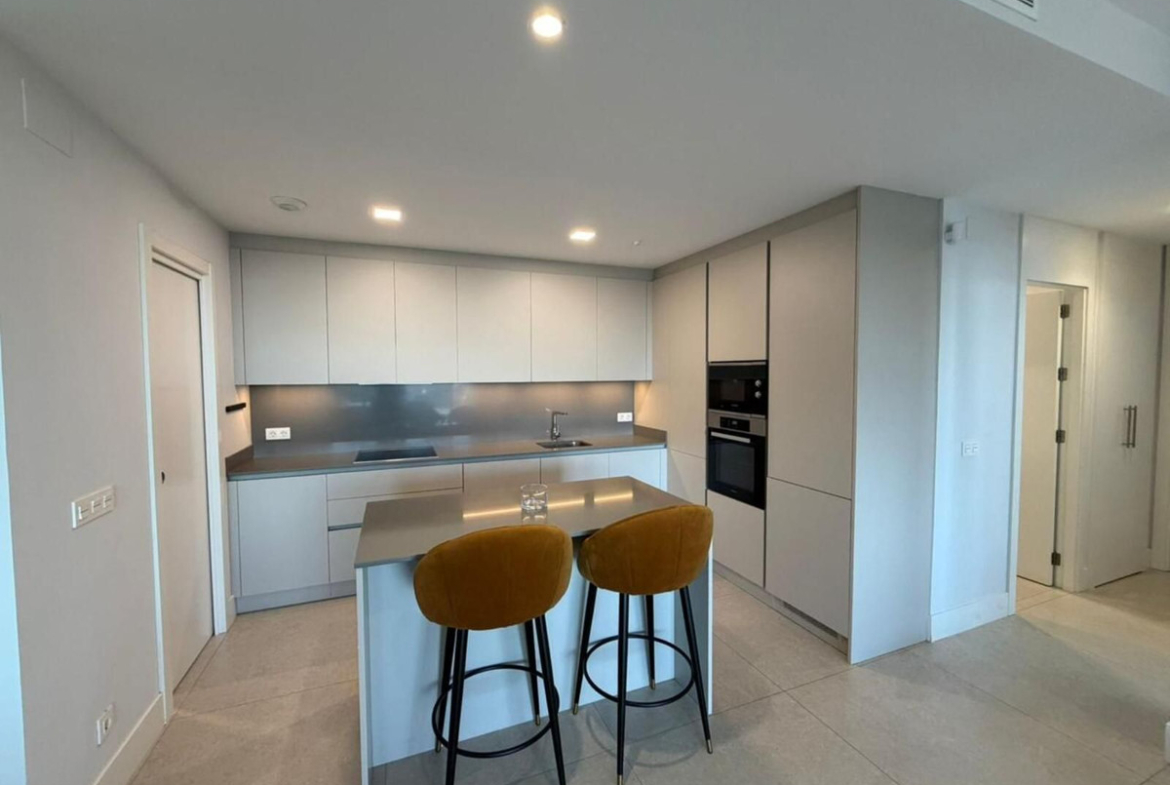 The modern designer kitchen is fully equipped with high-quality appliances and premium finishes, combining style and functionality.