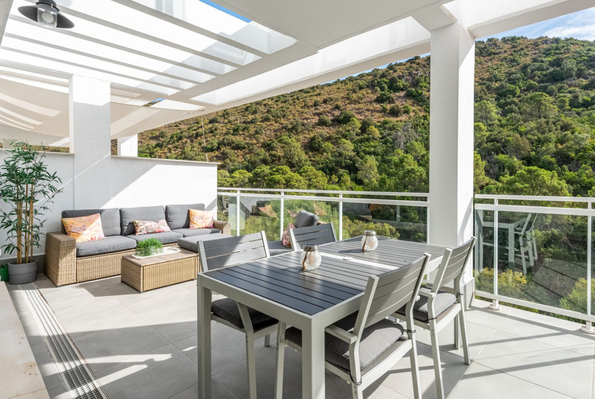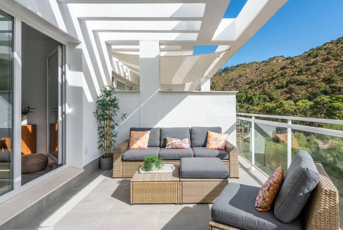 A private terrace extends the living space outdoors, providing an ideal spot for al fresco dining, relaxing, or simply enjoying the pleasant views of the natural surroundings that make Benahavís so special.