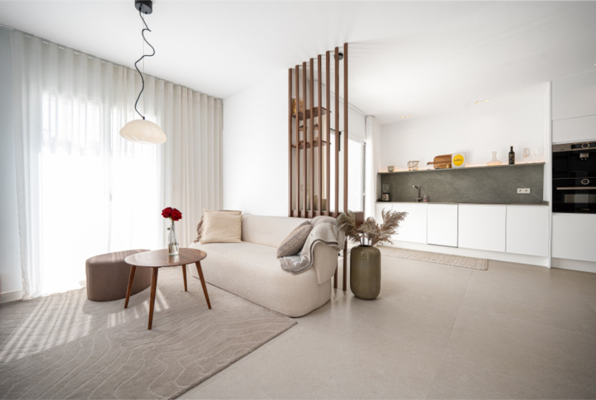 The apartment spans a generous 110 square meters of thoughtfully designed living space, expertly configured to maximize comfort and utility. It features two beautifully appointed bedrooms and three elegant bathrooms, each offering a private retreat within the home. The main terrace, notable for its substantial size and dual orientation to the south and east, invites abundant natural light throughout the day while providing captivating views at every hour. Ideal for breakfast with the sunrise or dinner under the stars, the terrace is a focal point of the home’s charm. For added convenience and security, the property also includes a designated parking space, ensuring ease of access at all times.