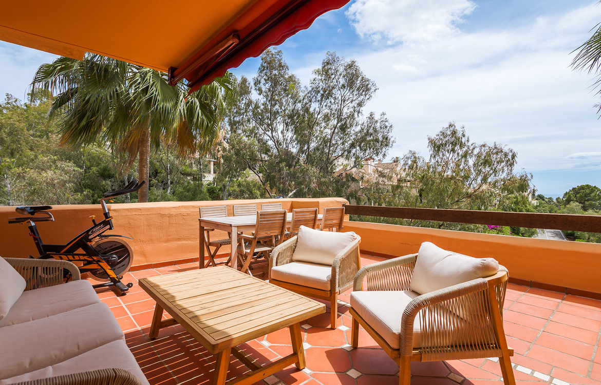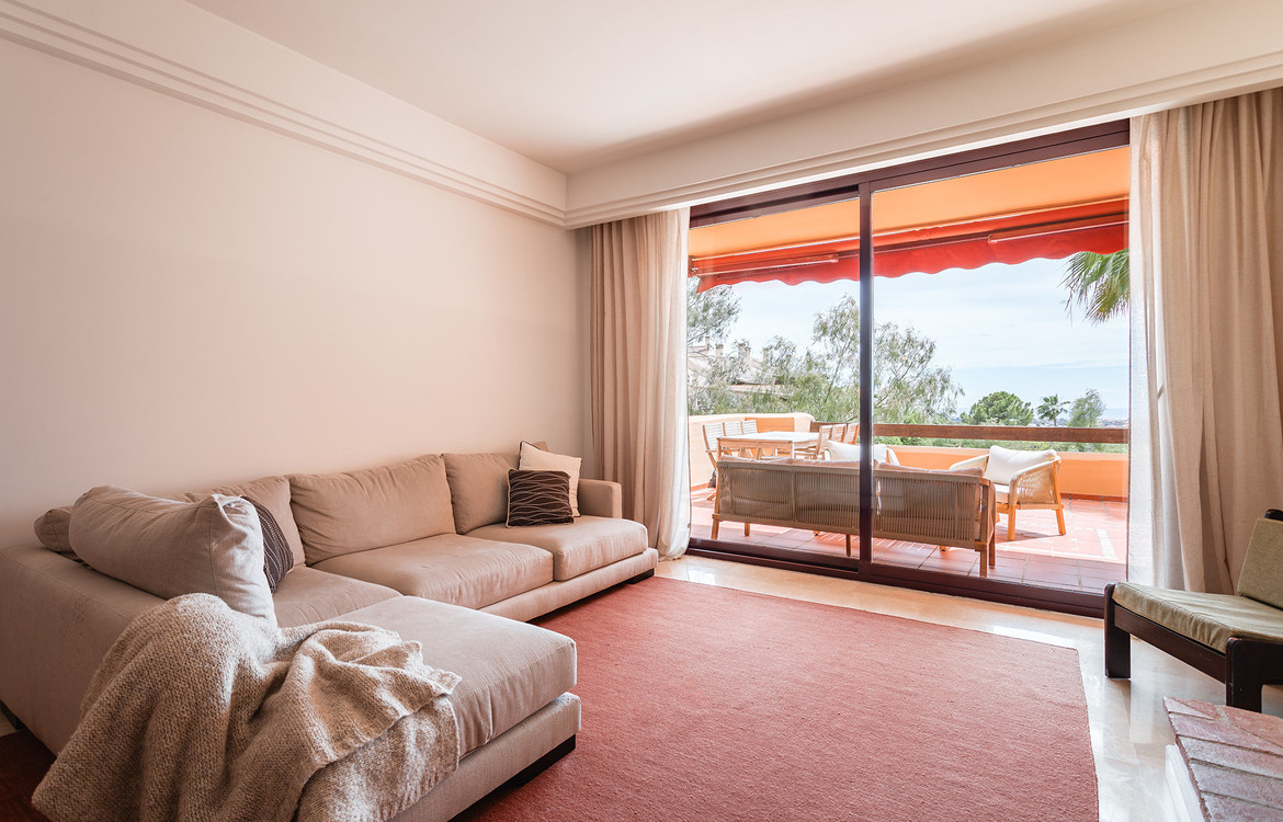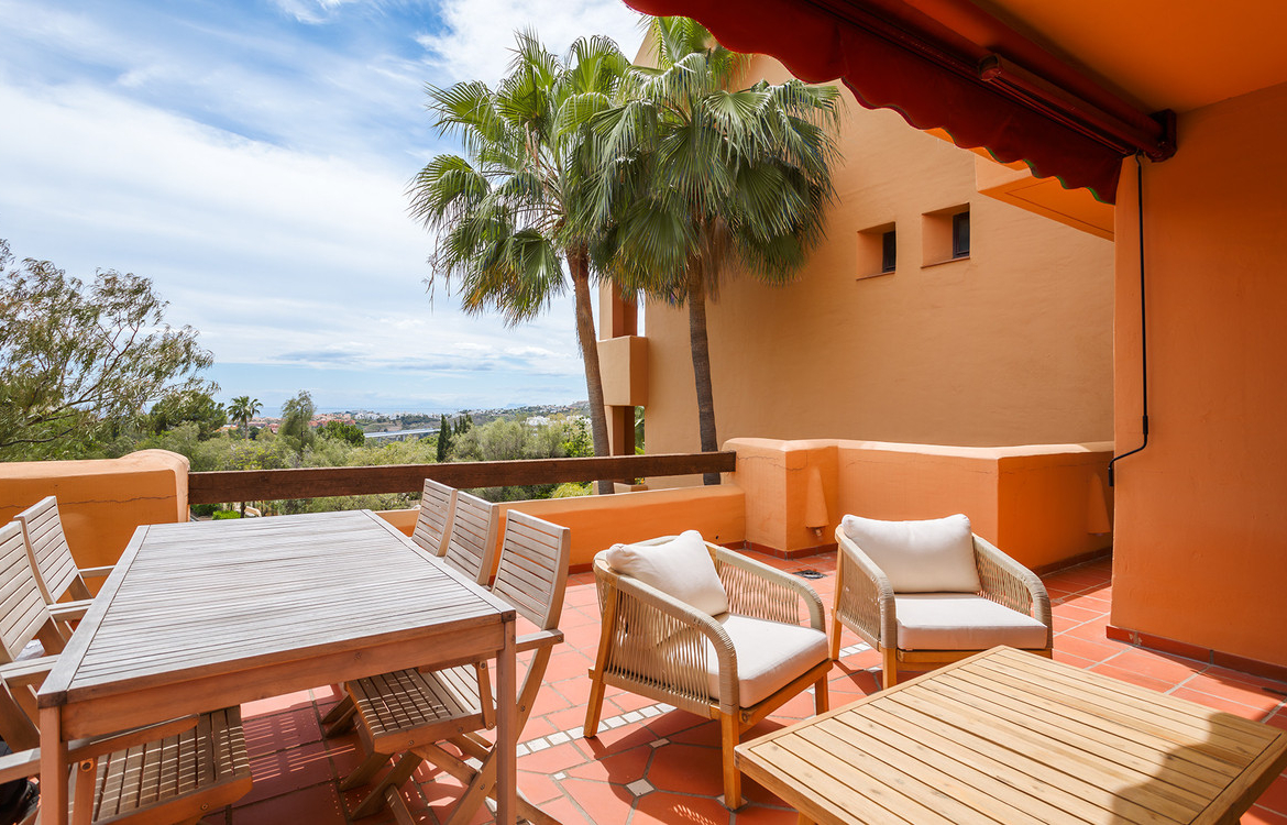 Perched just below the Monte Halcones commercial centre in the quiet Puerto del Almendro urbanisation, this spacious first-floor apartment offers an exceptional blend of privacy, panoramic sea views, and refined comfort. Located within a secure, impeccably maintained gated community, the property enjoys total tranquillity while being just a 5-minute drive from the beach and San Pedro, and a short stroll to local shops, restaurants, and cafés.