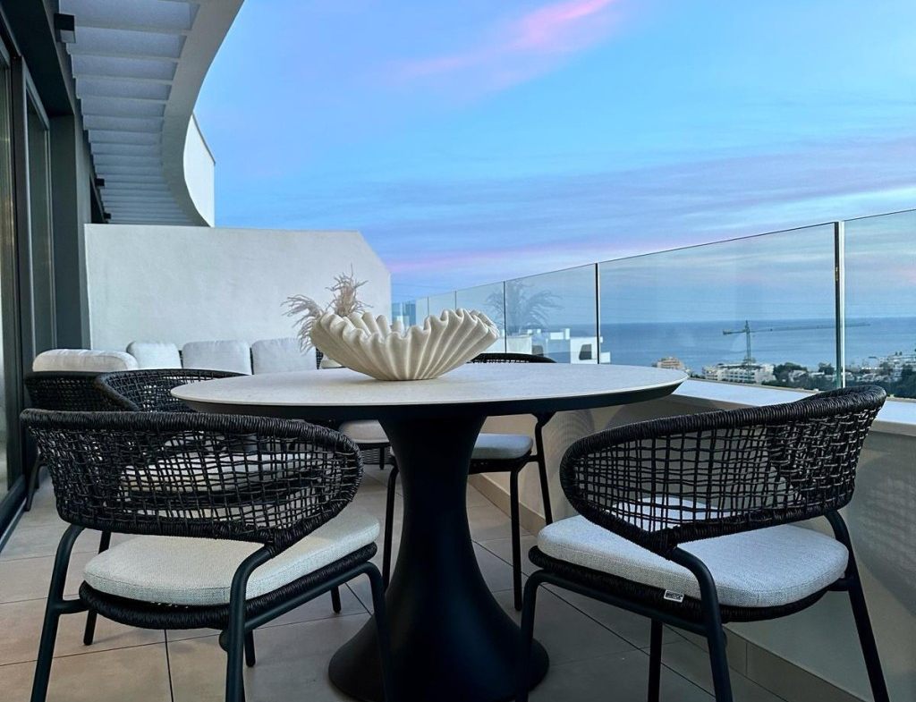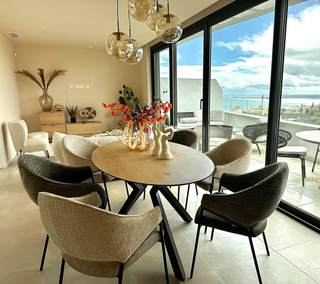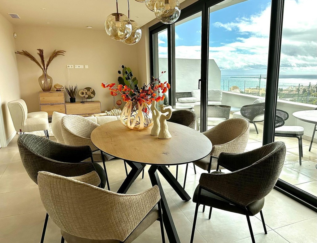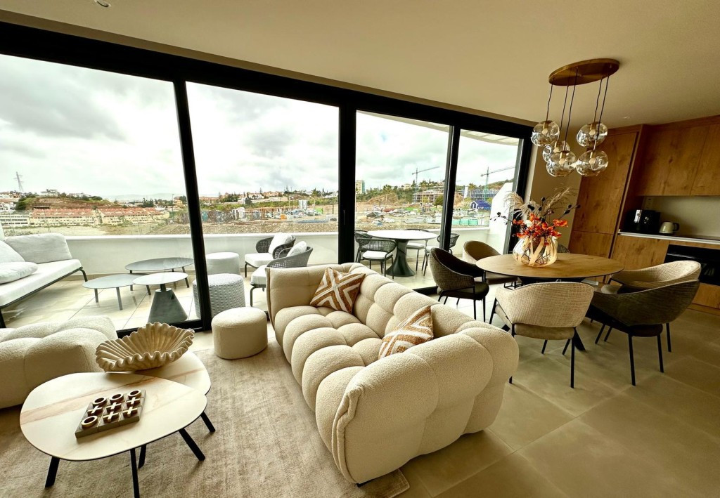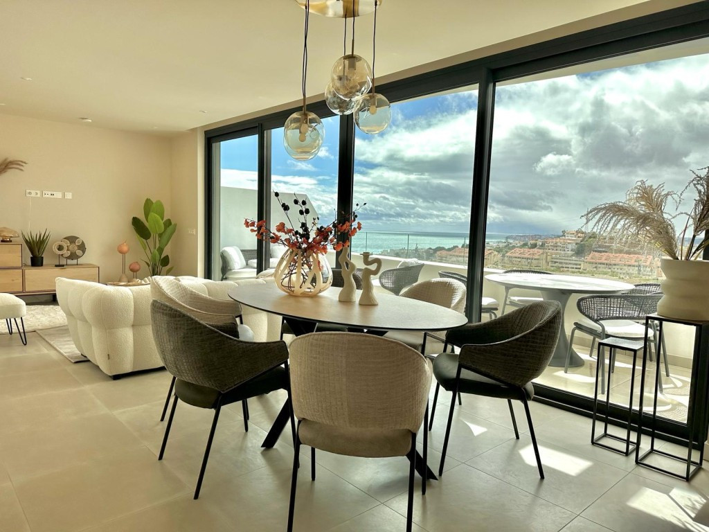 New built modern style penthouse in El Higueron en Fuengirola with two bedrooms and one bathroom, open plan kitchen, living room and with stunning terrace with panoramic sea views, sold furnished with quality furniture and including an exterior parking space, an underground parking space and a storage room. Air conditioning hot and cold via aerothermia, electric blinds in the living room, dim switches in all rooms, tv and internet connections in the living and bedrooms, underfloor heating and special tiles and rain shower in the bathroom. Gated complex with pools and facilities. The beach is a 15 minute walk away.