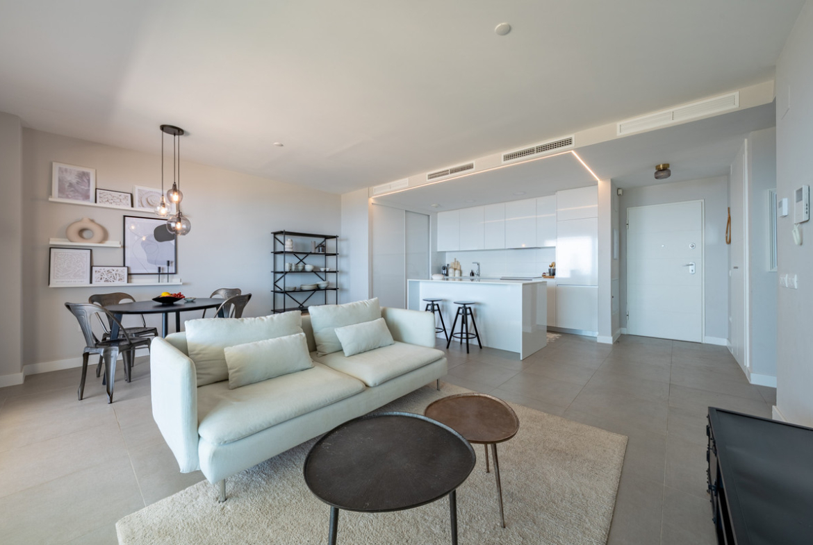 Step inside to discover a bright and spacious layout, featuring a generous living area, a fully equipped open-plan kitchen, and floor-to-ceiling windows that frame some of the most breathtaking panoramic sea views in the area. The highlight of the home is undoubtedly the expansive south-facing terrace, perfect for dining, relaxing, or simply soaking up the Mediterranean sun.