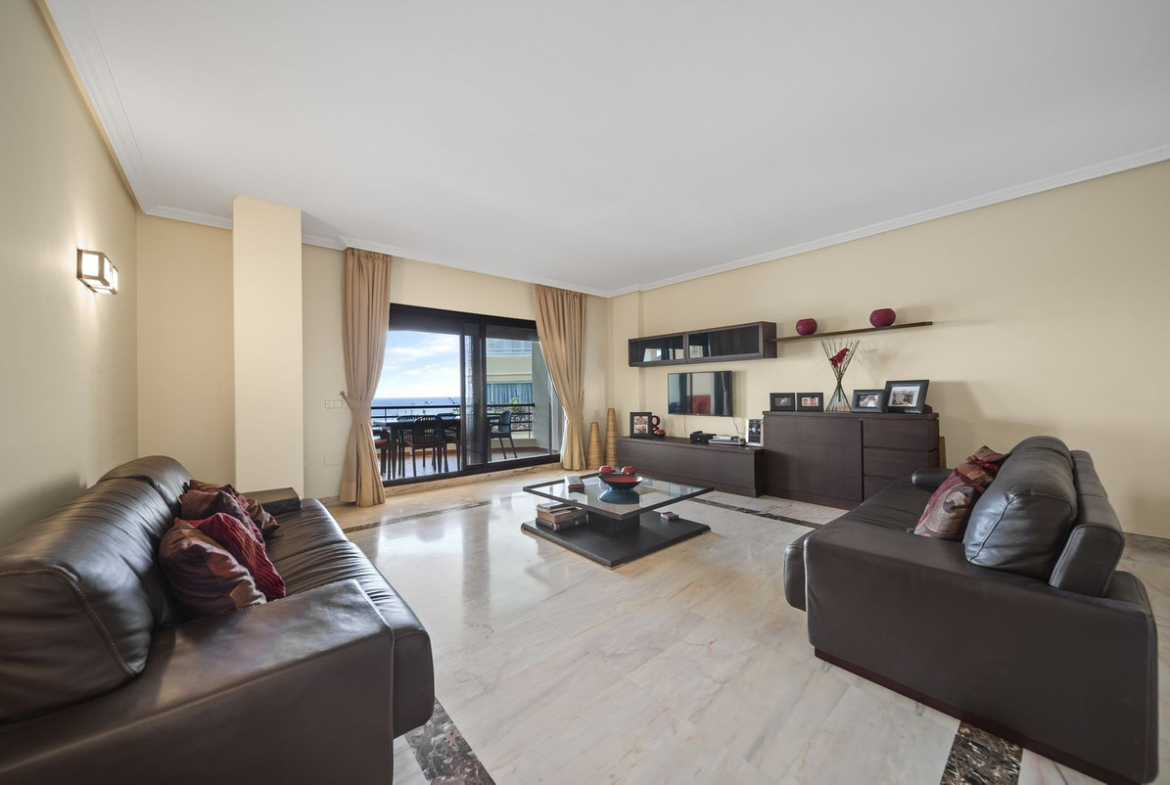 Designed for the discerning buyer, the apartment boasts a spacious entrance hall leading to a fully furnished and equipped kitchen. The expansive living and dining area opens onto a stunning covered terrace, offering breath-taking, uninterrupted sea views. The large master suite enjoys sea views, while the second bedroom is also large with built in wardrobes.