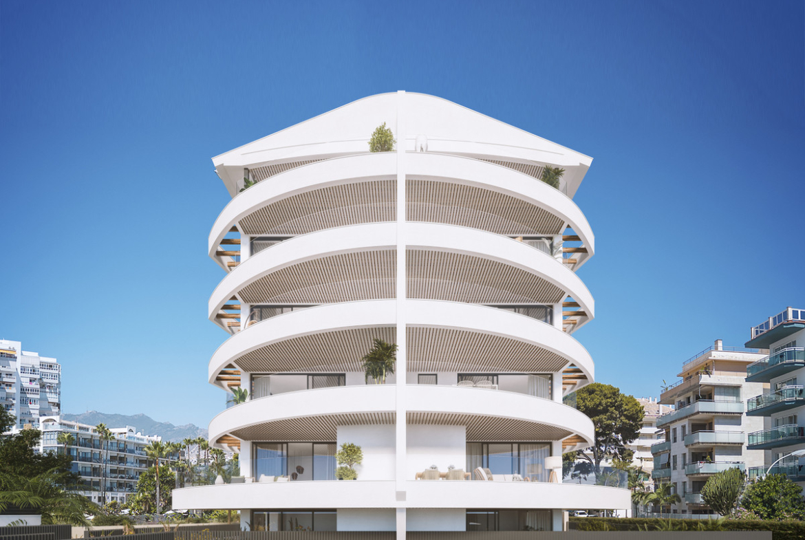 Situated in the vibrant heart of Benalmádena, just steps from the marina and the beach, this exclusive development blends bold architecture with coastal elegance. Its distinctive wave-like façade opens onto expansive terraces, inviting in the Mediterranean breeze and framing panoramic sea views.