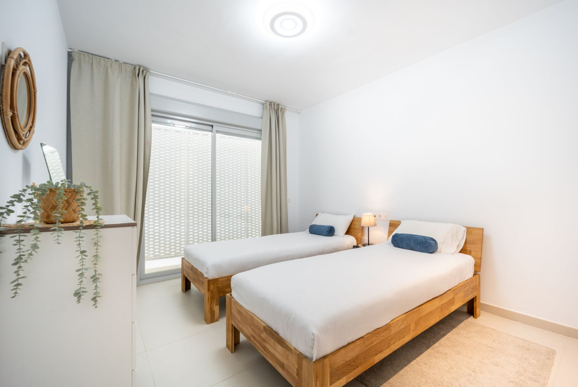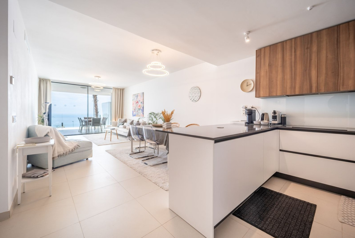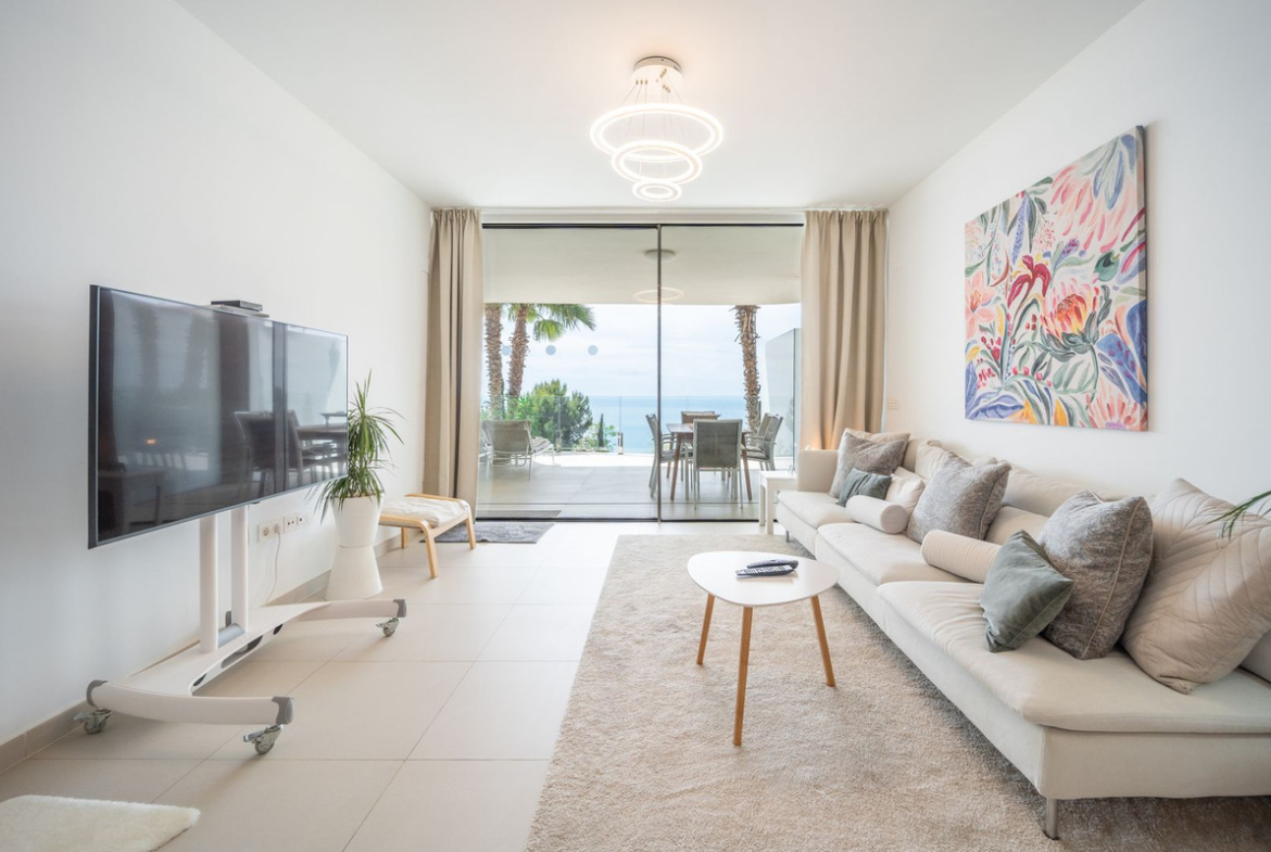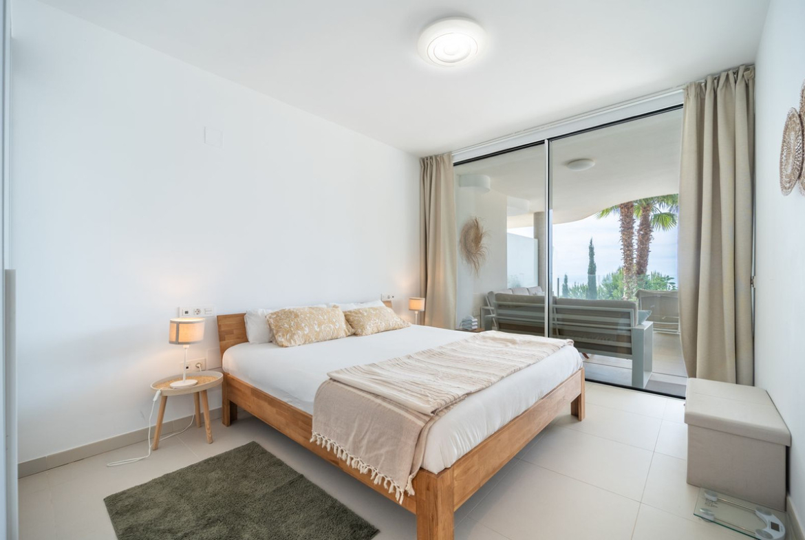 Amazing south facing apartment, located in the exclusive complex of Stupa Hills. Consists of 2 bedrooms, 2 bathrooms, open plan kitchen fully furnished and equipped with electricial appliances and access to a spacious laundry area with washing machine and dryer. Spacious living-dining room with access to a large terrace of 42m2 with sea views. Air conditioning hot and cold, video intercom, electric blinds in secondary bedroom, domotic system, pre-installation alarm system, built-in wardrobes. Includes two parking spaces and one storage room.