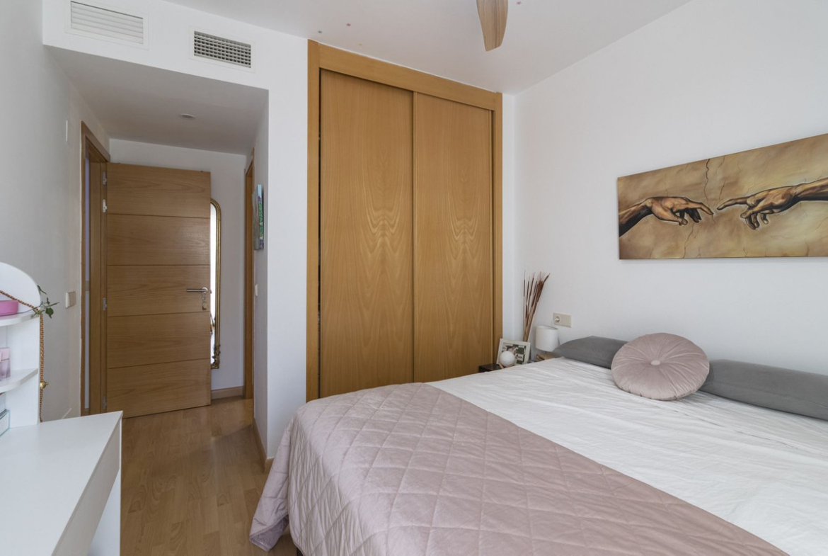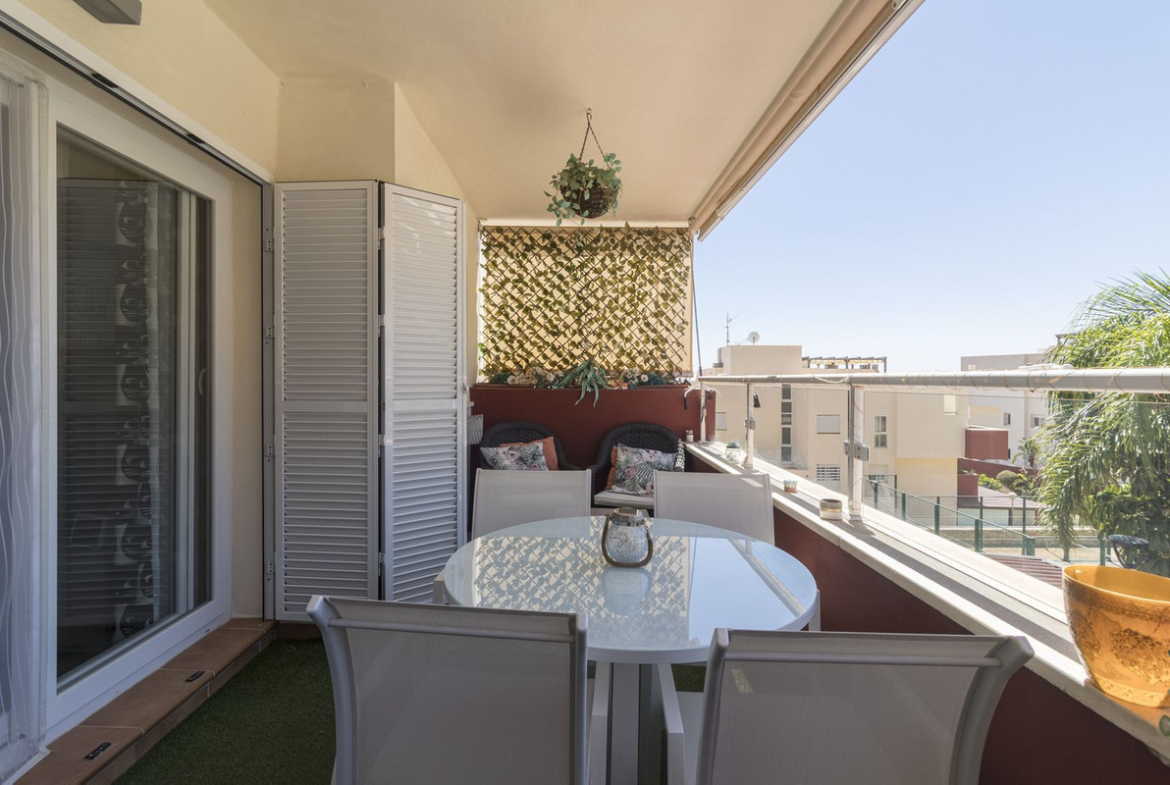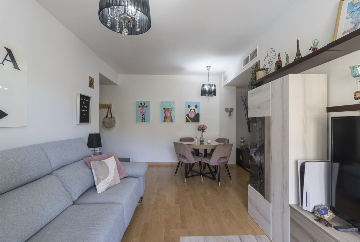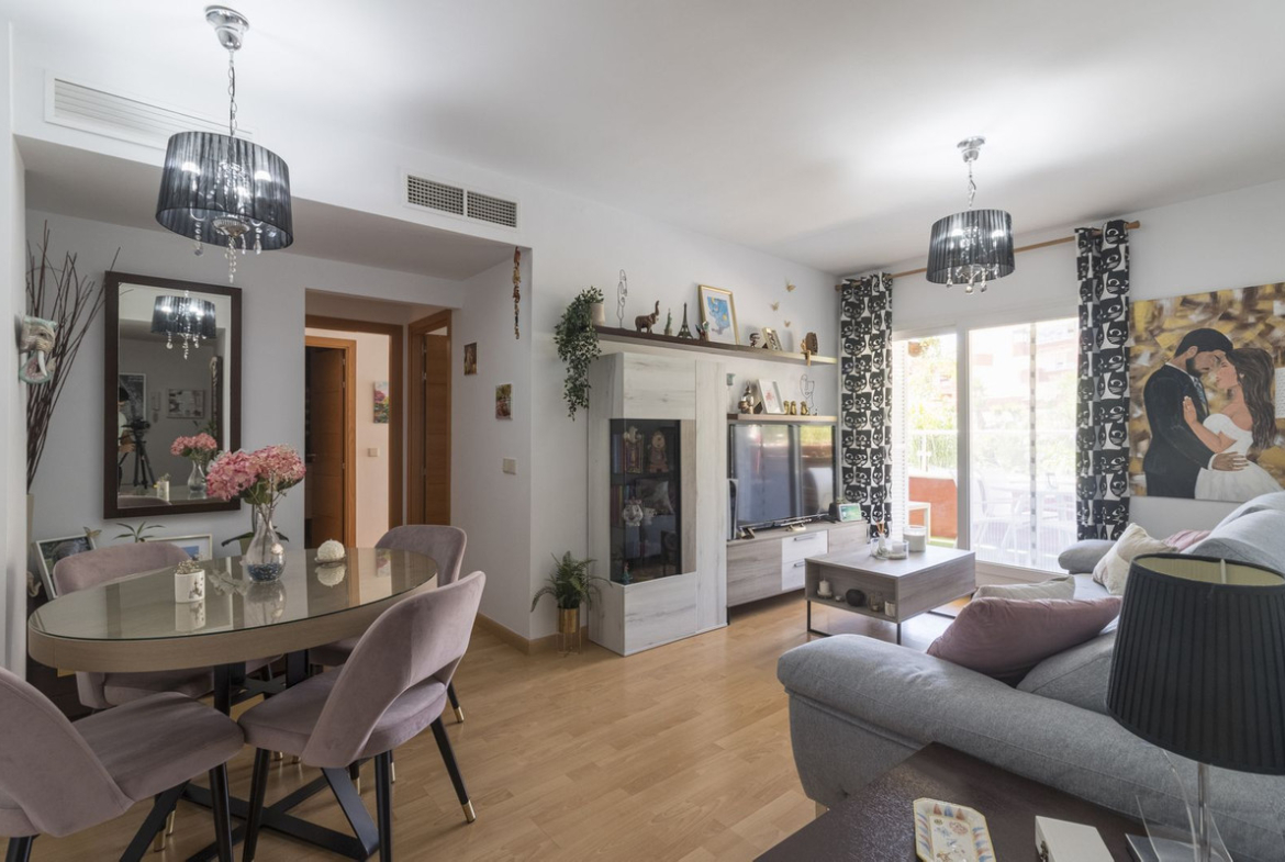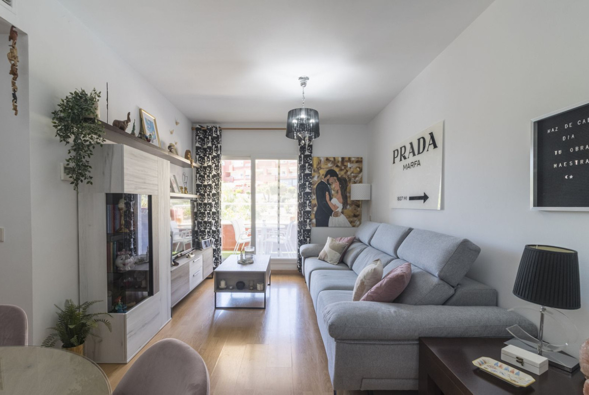 Spacious, bright living-dining room with access to the terrace. The terrace overlooks the pool, has large planters, and a water and electrical outlet. There's plenty of space for a storage area, a terrace set, and a chill-out area.