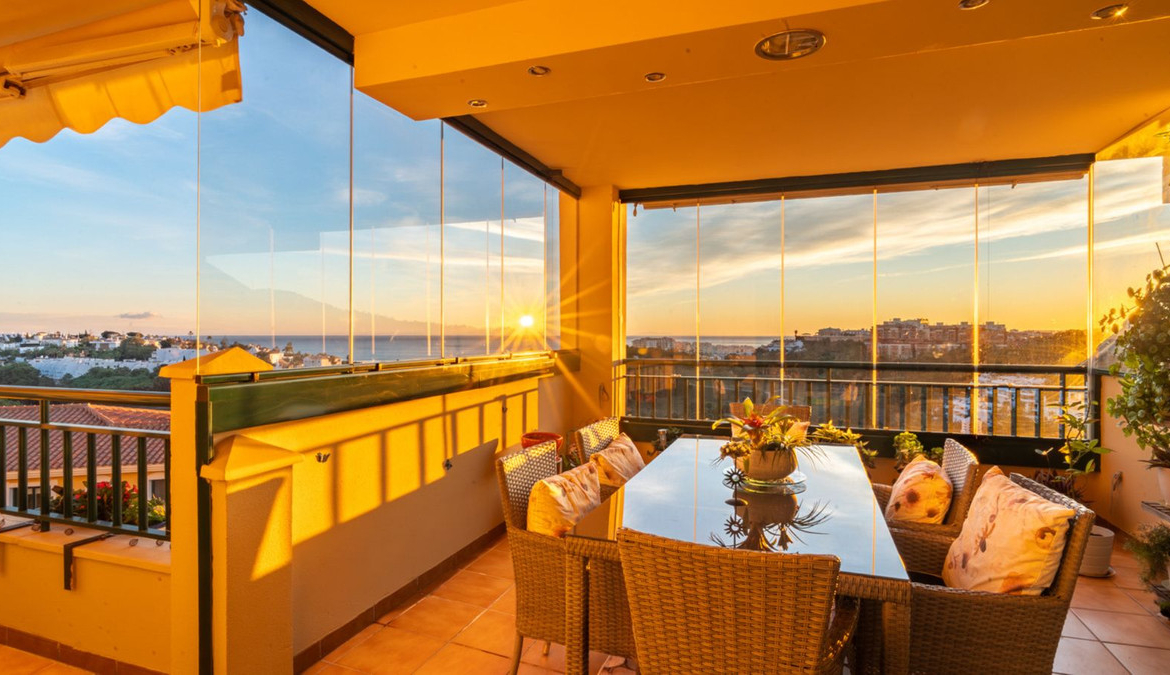 Apartment located in a well-established residential development next to Torrequebrada Golf, offering a comfortable and well-planned layout. The property features bright, generously sized living spaces, with the main living area opening directly onto an enclosed terrace fitted with glass curtains. From here, there are open views over the surrounding green areas and partial sea views in the distance. The interior is practical and well maintained, suitable for both permanent living and holiday use.