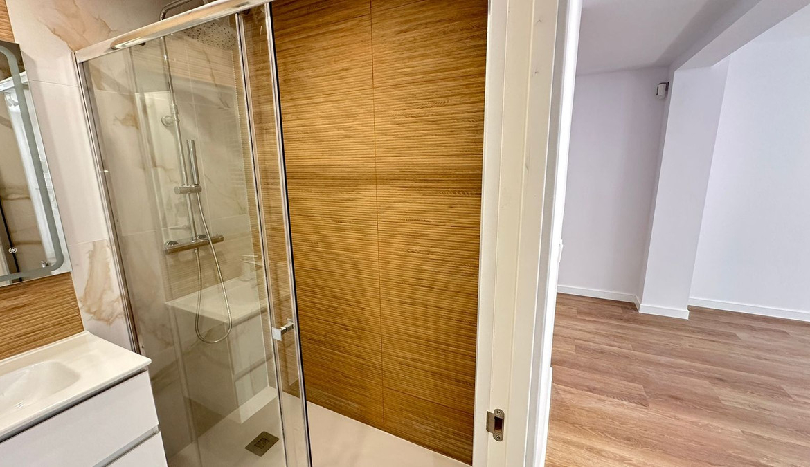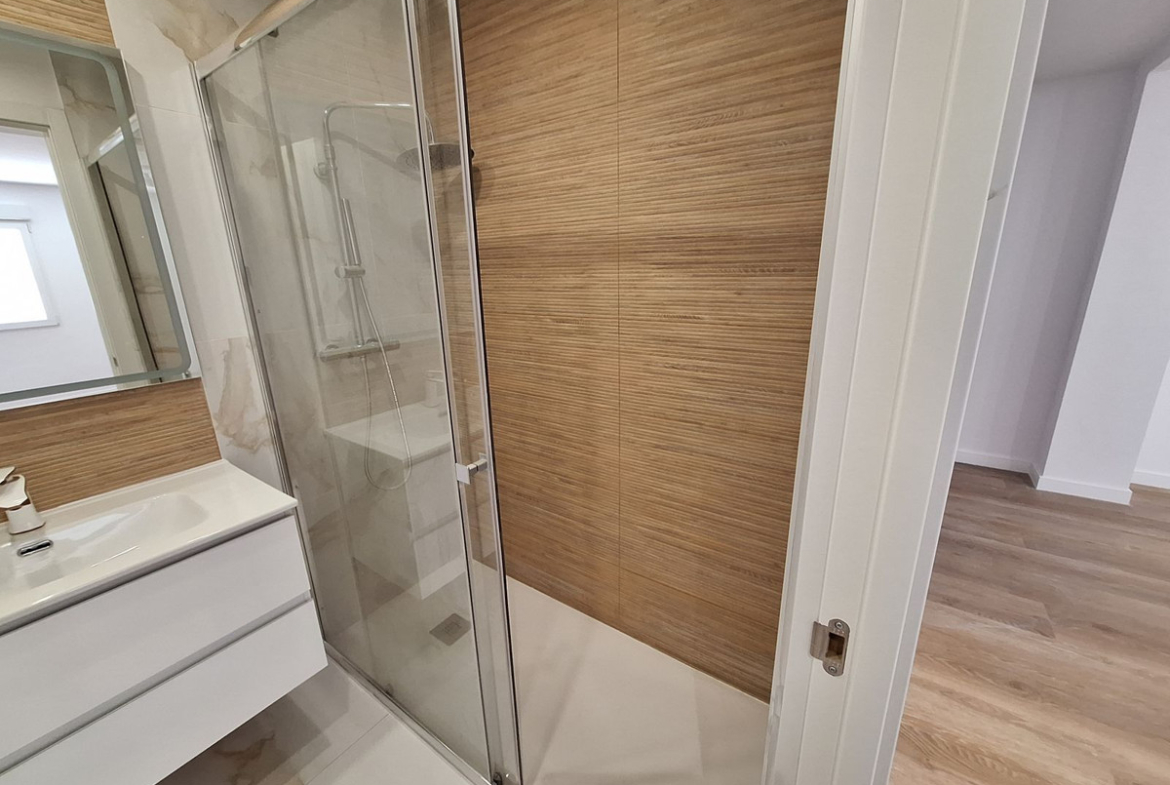 This bright and spacious (80 m2) apartment has been completely reformed using high quality materials and offers a hallway entrance with storage, two double bedrooms, 2 bathrooms with walk in showers (one ensuite) and a bright and spacious lounge diner incorporating a fully fitted an equipped American kitchen.