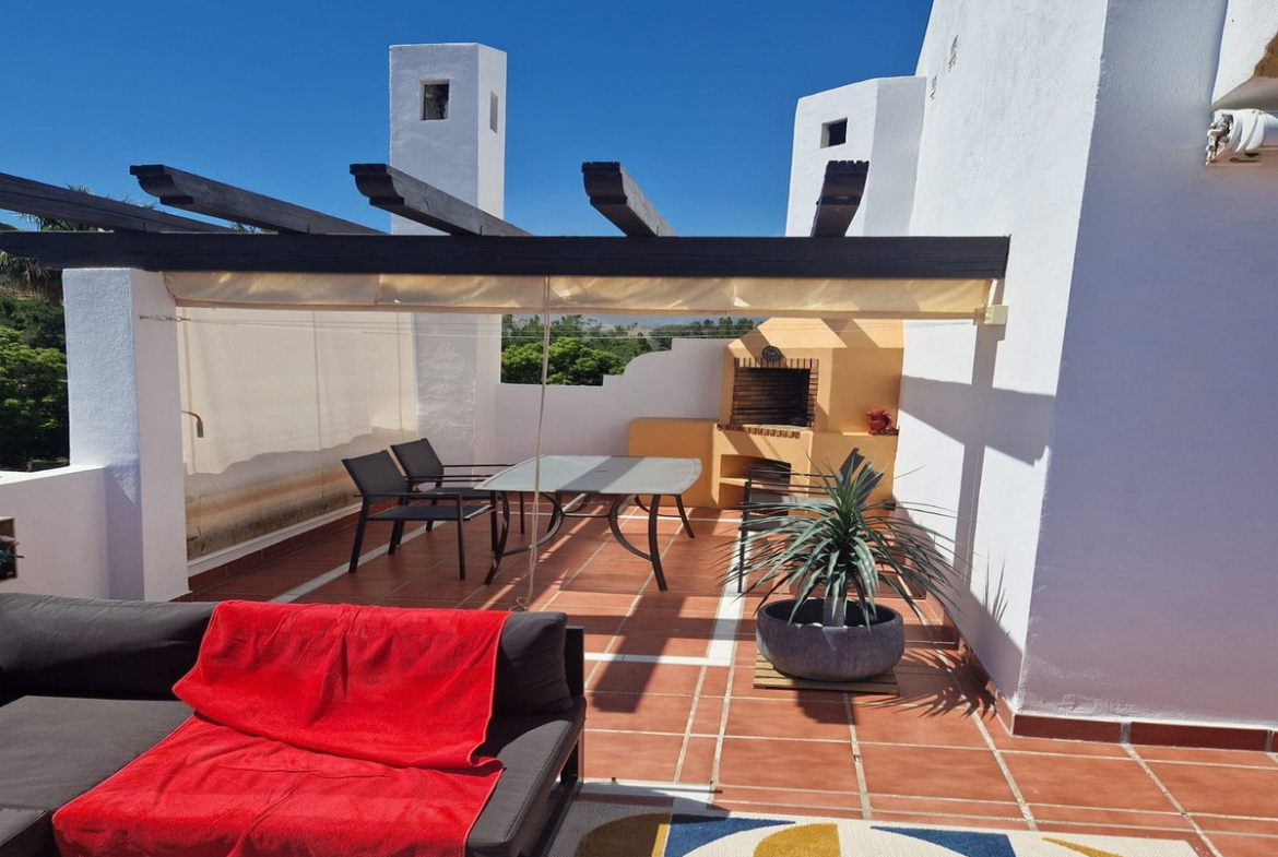 Presented in excellent condition, the penthouse features a fully fitted kitchen, elegant marble flooring and fitted wardrobes. The spacious living area opens seamlessly onto a vast private terrace, ideal for outdoor dining, entertaining, or simply relaxing while enjoying the spectacular views over the golf course, mountains, countryside, and communal gardens. A built-in barbecue makes the terrace perfect for year-round enjoyment.