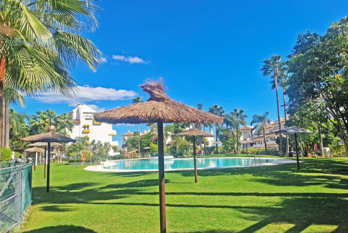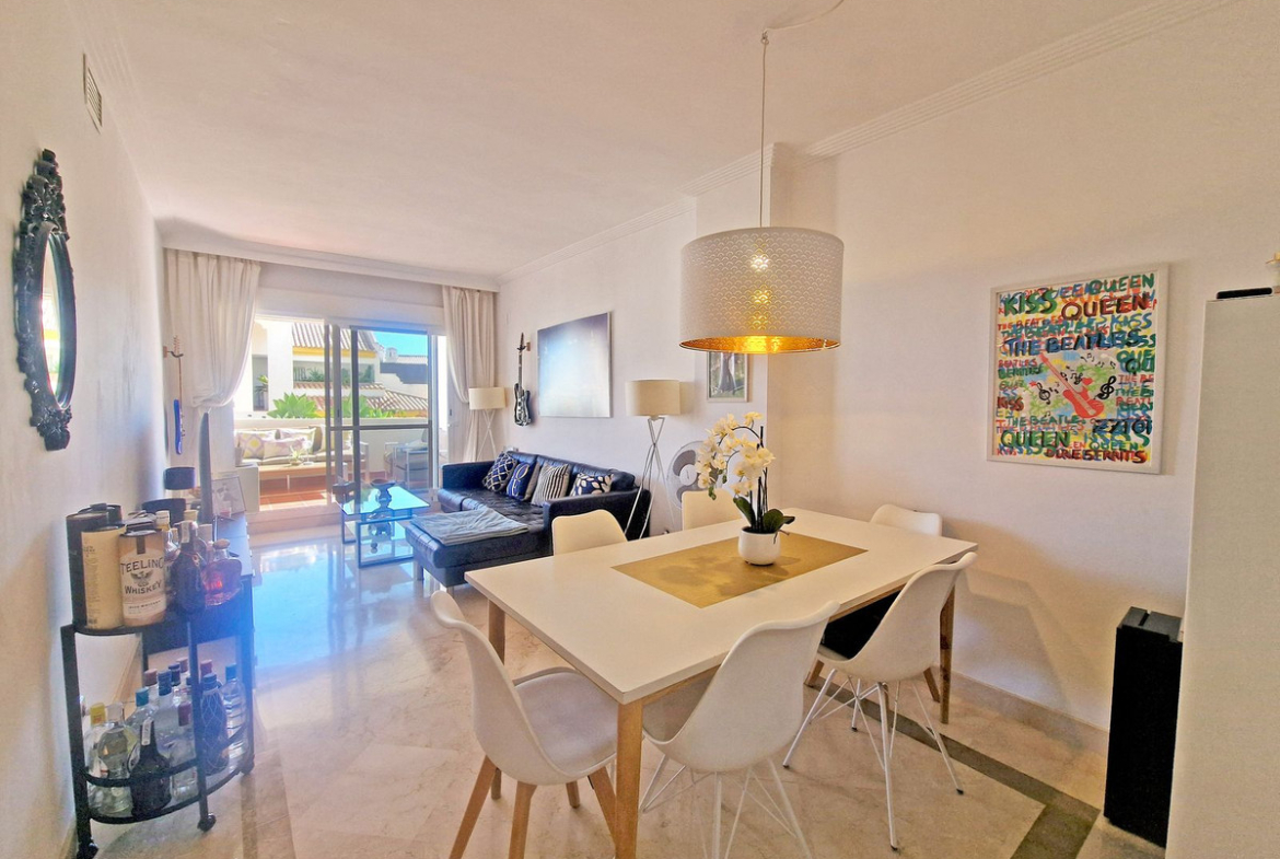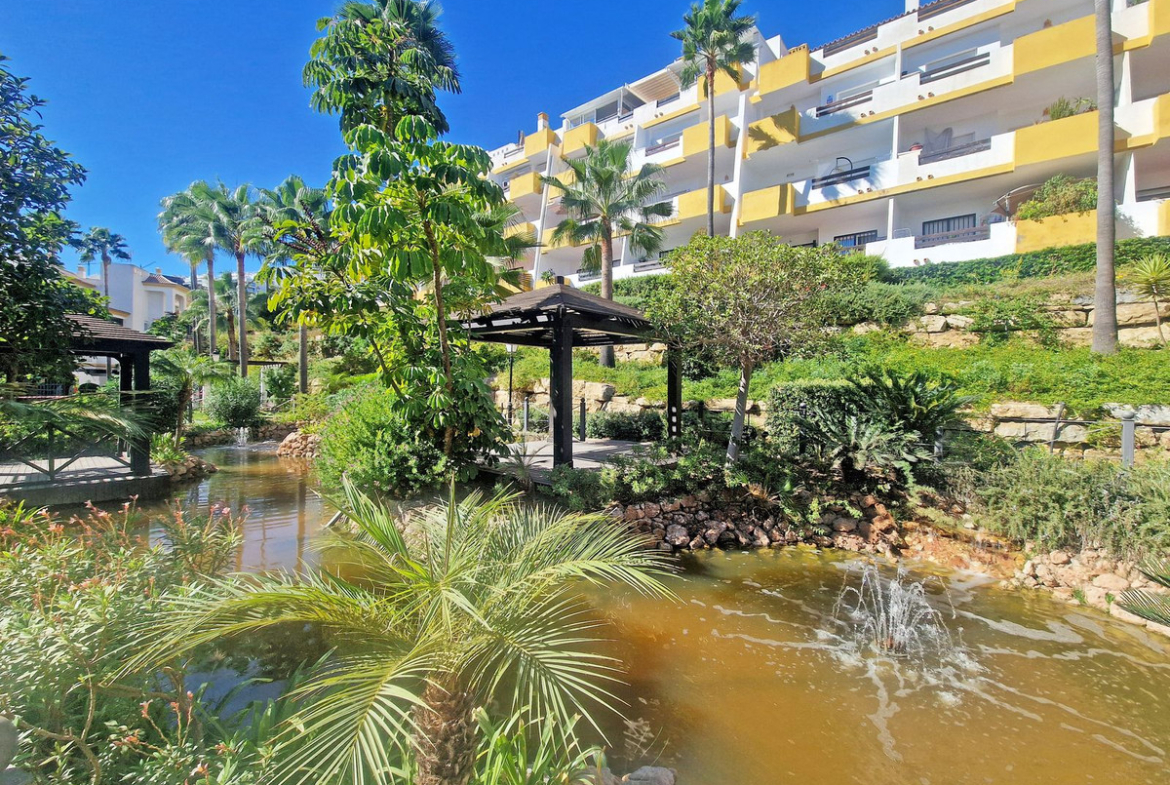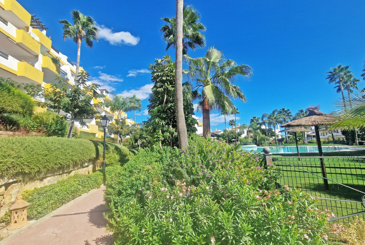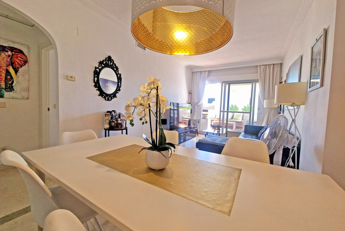 This charming and bright apartment features two bedrooms and two bathrooms (one of them ensuite). The spacious living and dining area opens onto a sunny south-facing terrace overlooking the beautifully maintained communal gardens, with pleasant partial views of the golf course and the sea. The fully fitted independent kitchen offers practicality and can easily be opened to the dining area to create an open-plan layout if desired. The property boasts marble floors throughout, A/C, double glazing, and is sold fully furnished.