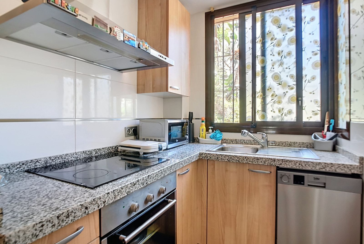 This charming apartment features 2 well-appointed rooms, including a suite room with a private bathroom, a cozy dining room, and a modern kitchen equipped with appliances and a dishwasher. The elegant marble floors and double windows enhance the living experience, while the covered terrace provides a perfect spot to unwind and take in the stunning mountain and sea views.