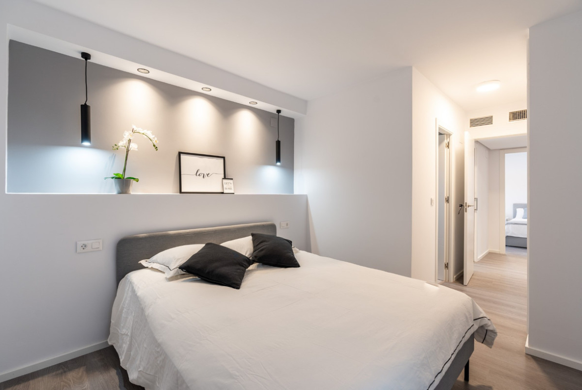 The base floor has its own kitchenette, and 2 more bedrooms each with their own bathroom. From the bedrooms you can access the shared terrace.