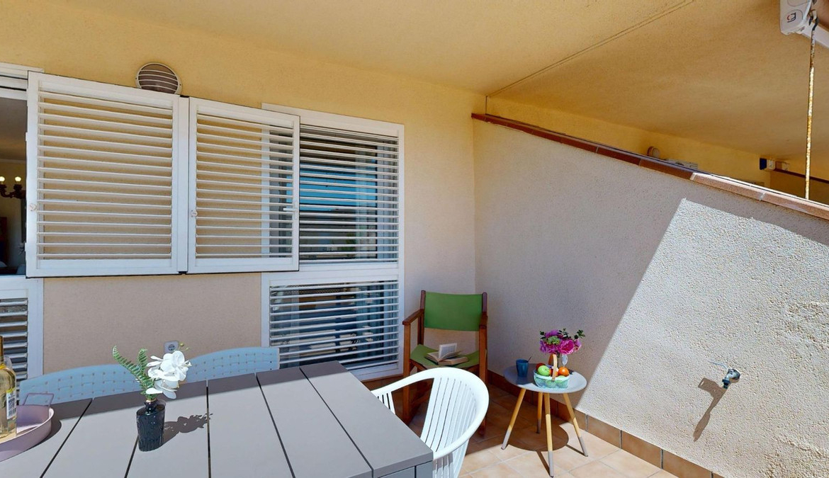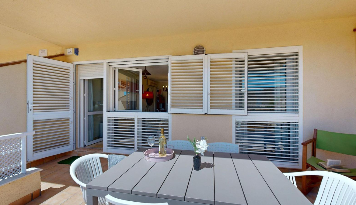 If we enter from the main avenue, we have access to a porch with an entrance to the laundry area, with a full bathroom, ideal for washing off sand and salt before entering the house. This part leads to a spacious kitchen-diner with ample storage capacity. It is connected to the living-dining room which opens directly onto the south-facing terrace and to an exclusive and private area of the urbanization, perfect for enjoying total privacy and through which there is also access to the property. It has two spacious bedrooms, the main one also facing south with a large window, and the second bedroom is large enough for a single bed and a bunk bed that folds away completely, leaving the entire space of the room free for use. Both bedrooms have large built-in wardrobes. Additionally, there is a second bathroom with a large walk-in shower serving the sleeping area.
