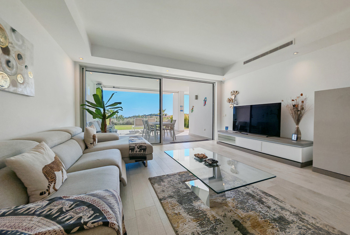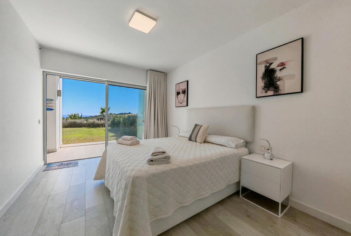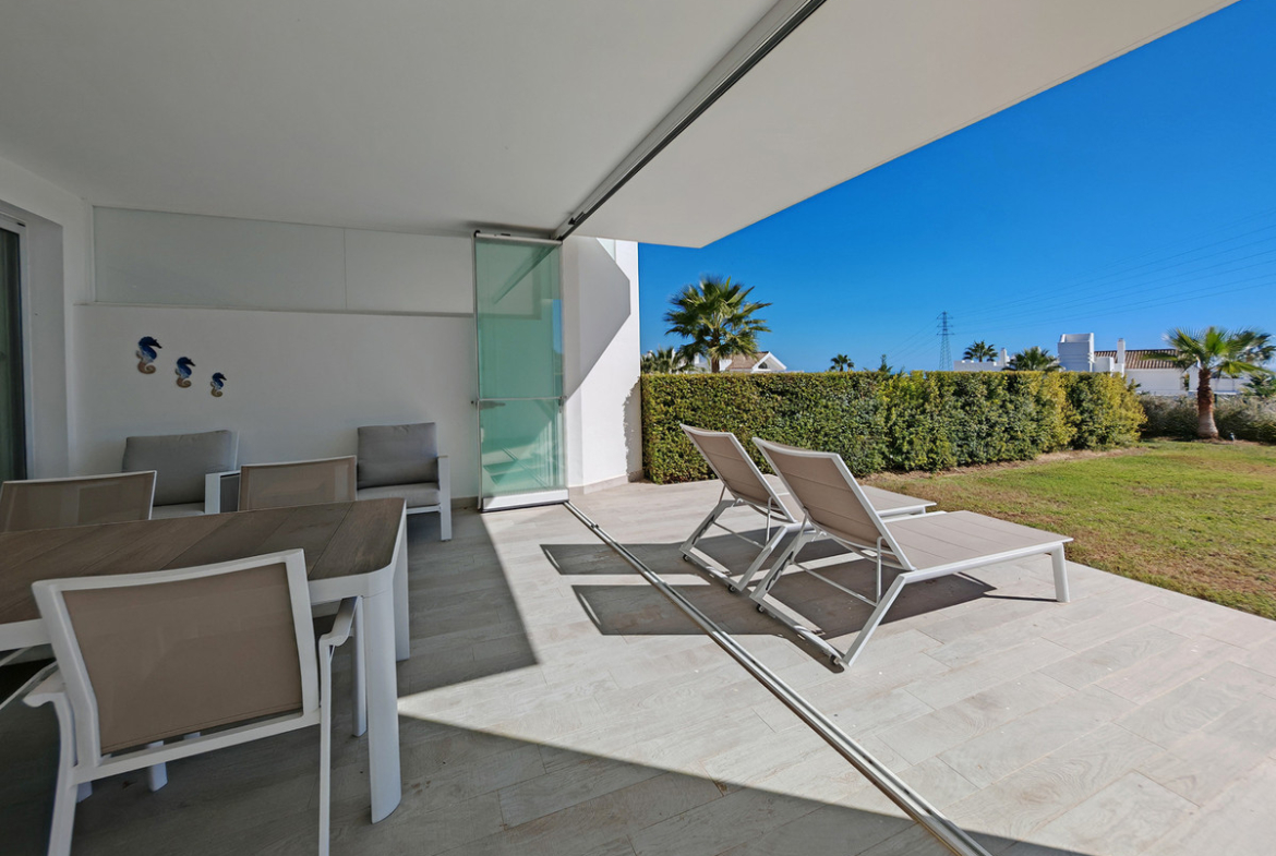 Ground Floor Apartment for sale in Alcazaba Lagoon, Casares with 2 bedrooms, 2 bathrooms, 1 on suite bathroom and with orientation south, with communal swimming pool, private garage (1 parking spaces) and private garden. Regarding property dimensions, it has 105.95 m² built, 47 m² plot and 40.62 m² terrace. Has the following facilities air conditioning, fully furnished, fully fitted kitchen, storage room, gym, alarm, double glazing, security service 24h, kitchen equipped, sea view, country view, internet – wi-fi, covered terrace, 24h service, gated community, garden view, panoramic view, close to golf and excellent condition.