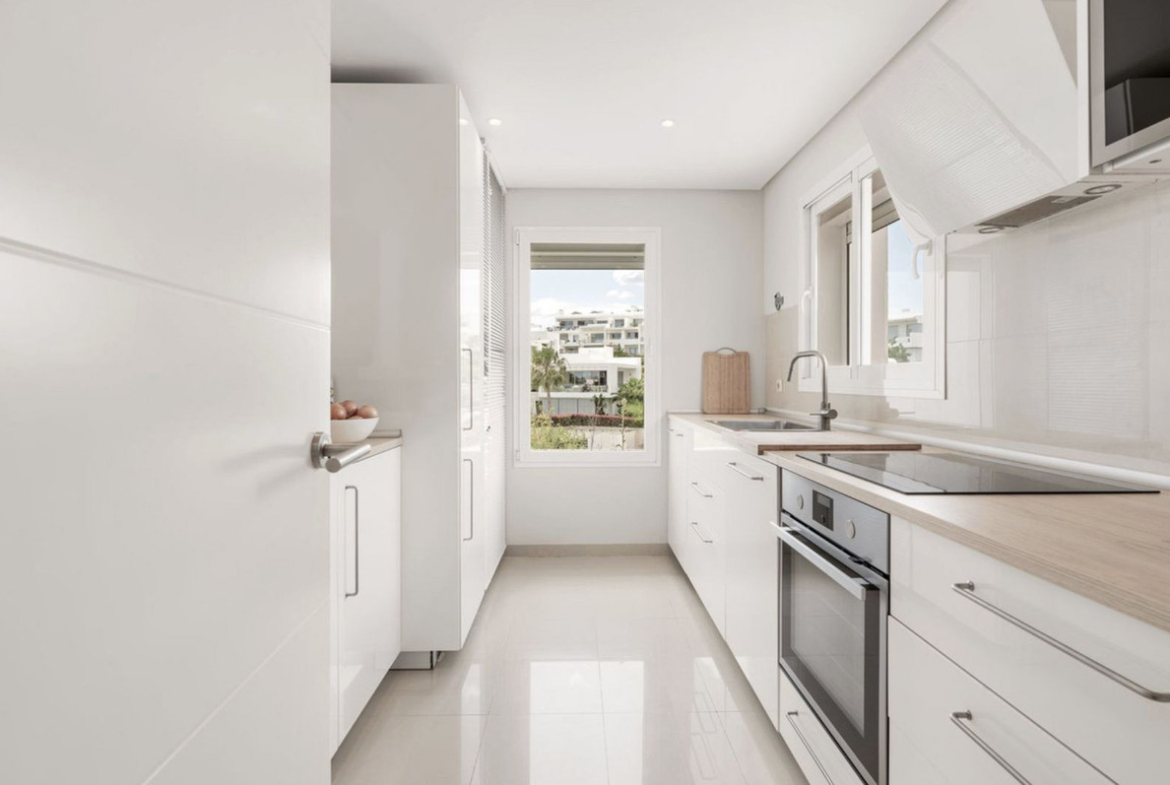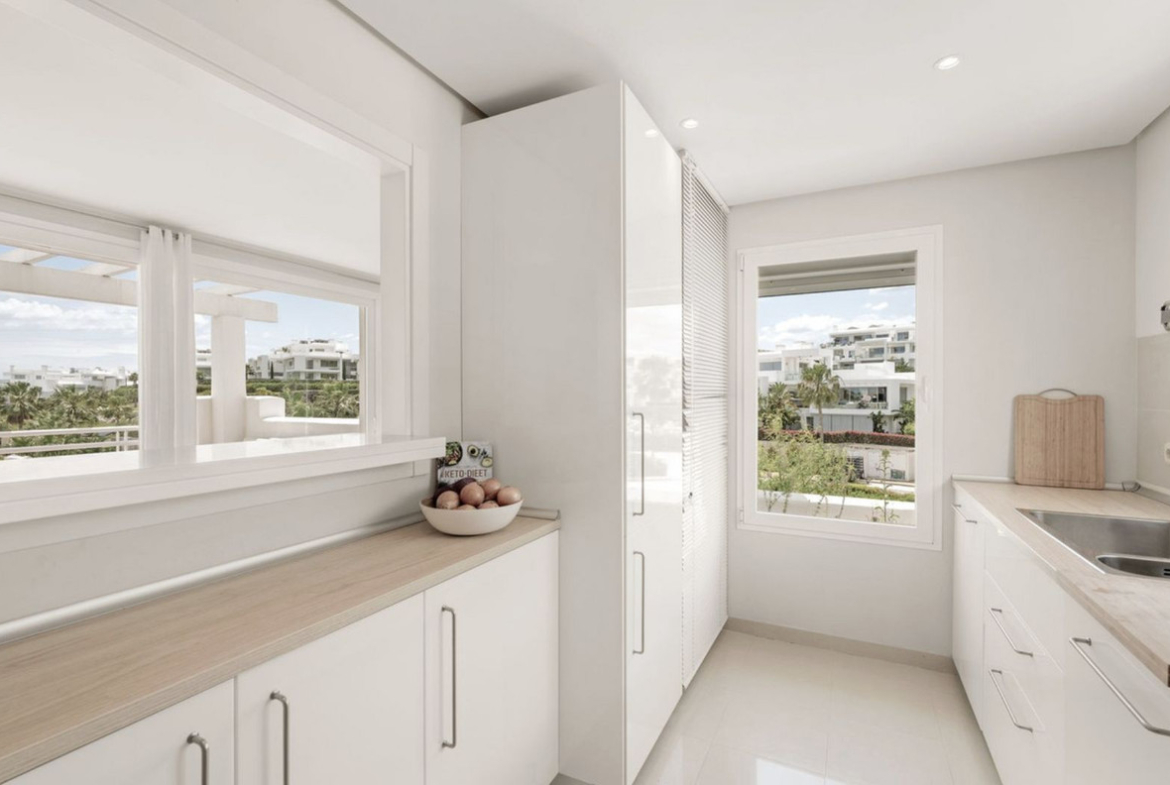 The apartment enjoys a desirable south orientation with open views over the gardens, the pool, and the Mediterranean. It features two terraces: the main south-facing one overlooking the communal areas and sea, and a secondary north-facing terrace with pleasant mountain views. Indoors, high ceilings and natural light define the home’s comfortable layout. The living room opens onto the main terrace, while the contemporary, fully equipped kitchen sits just behind it, joined by a convenient serving window.