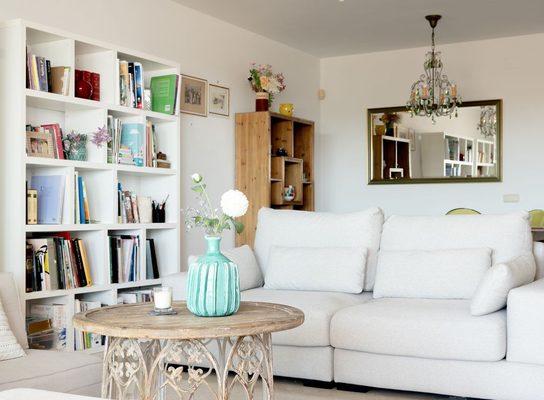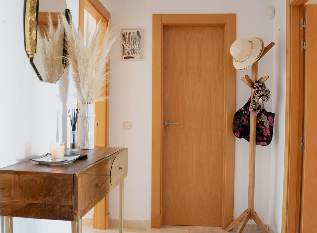 The property boasts a spacious, fully equipped kitchen with a separate utility room, as well as a bright and inviting living and dining area. From here, you step out onto a generous covered terrace with a desirable west-facing orientation, perfect for enjoying afternoon sun and sunsets. The terrace is fitted with fully foldable glass curtains, allowing for year-round use while offering lovely views over the communal gardens, the surrounding countryside, and even glimpses of the sea.