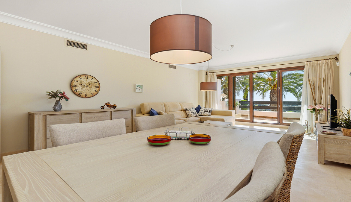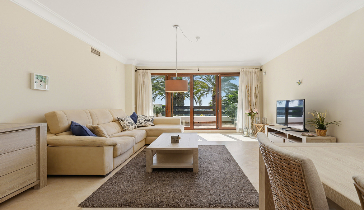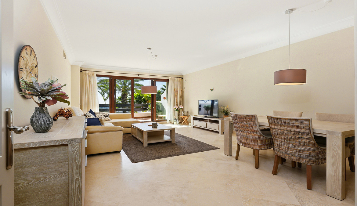 The interiors feel bright and welcoming, opening onto a generous south-west-facing terrace with stunning sea and mountain views, overlooking the communal pool. It is the kind of space that invites you to slow down, perfect for breakfast in the morning sun, long relaxed lunches, or a quiet glass of wine at the end of the day.