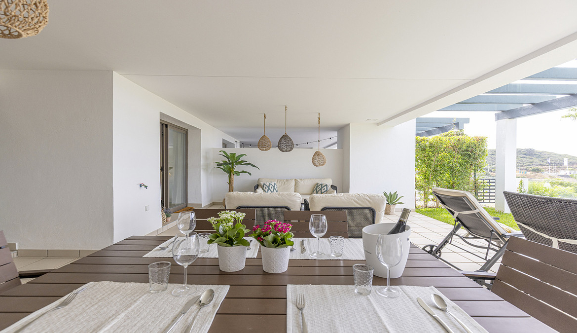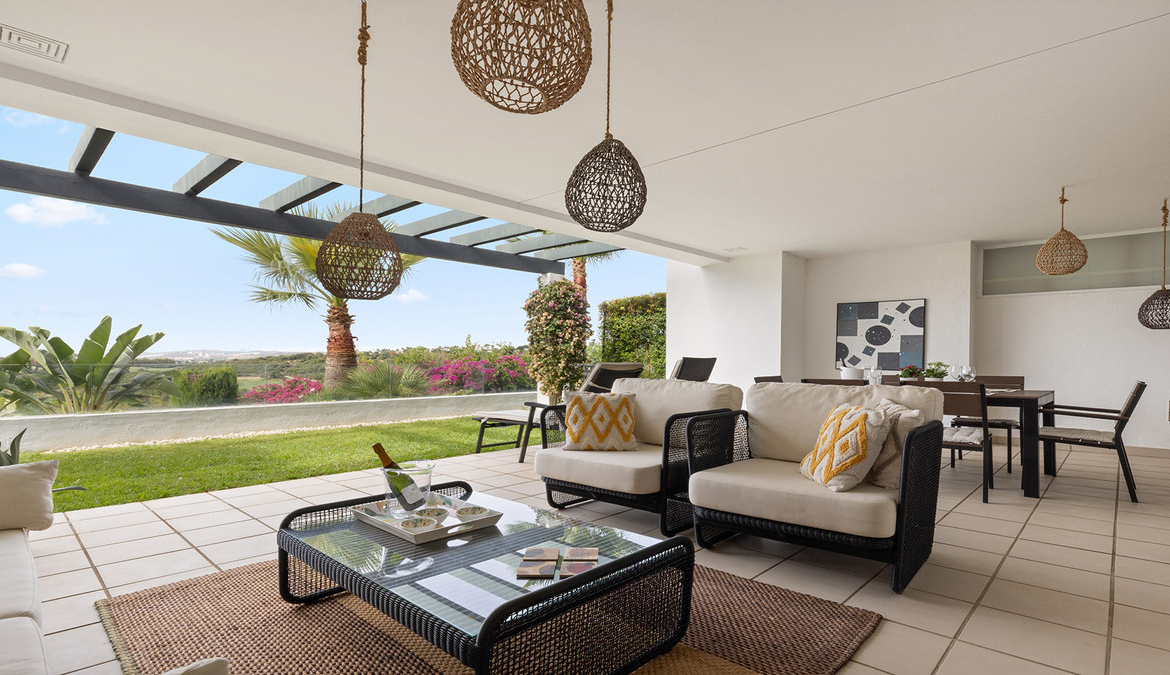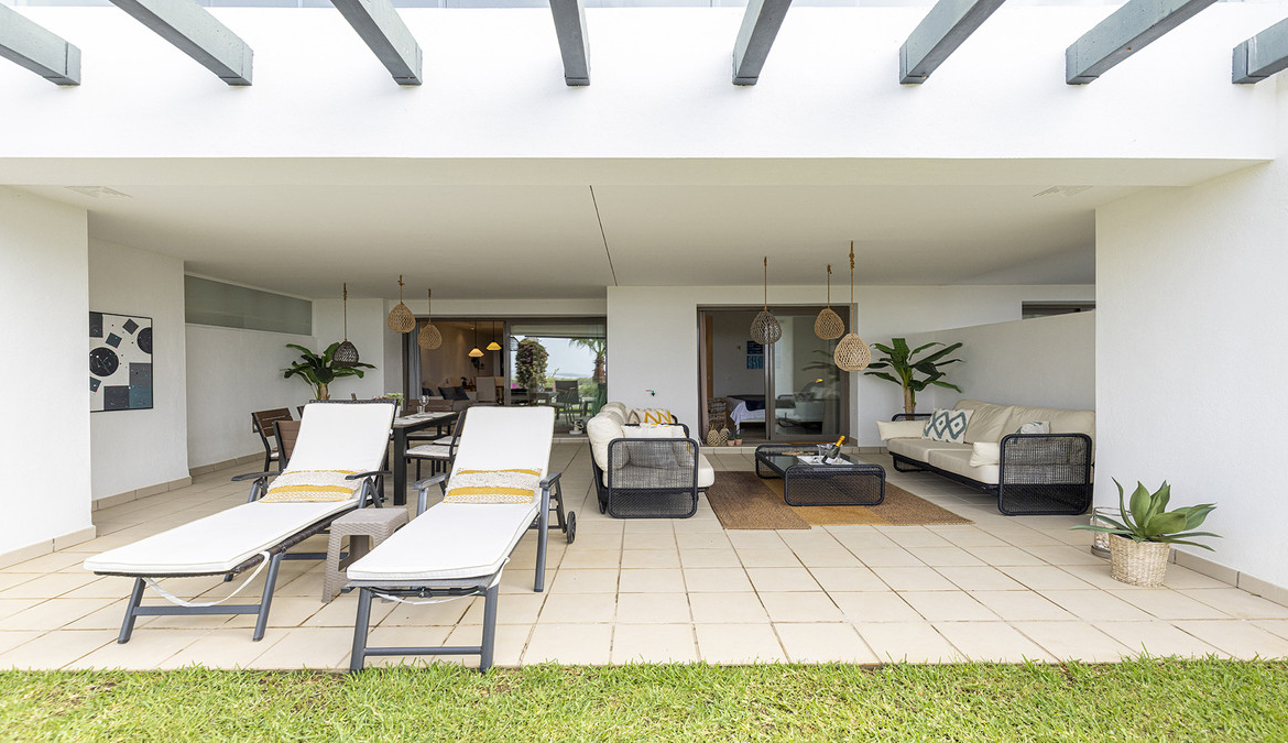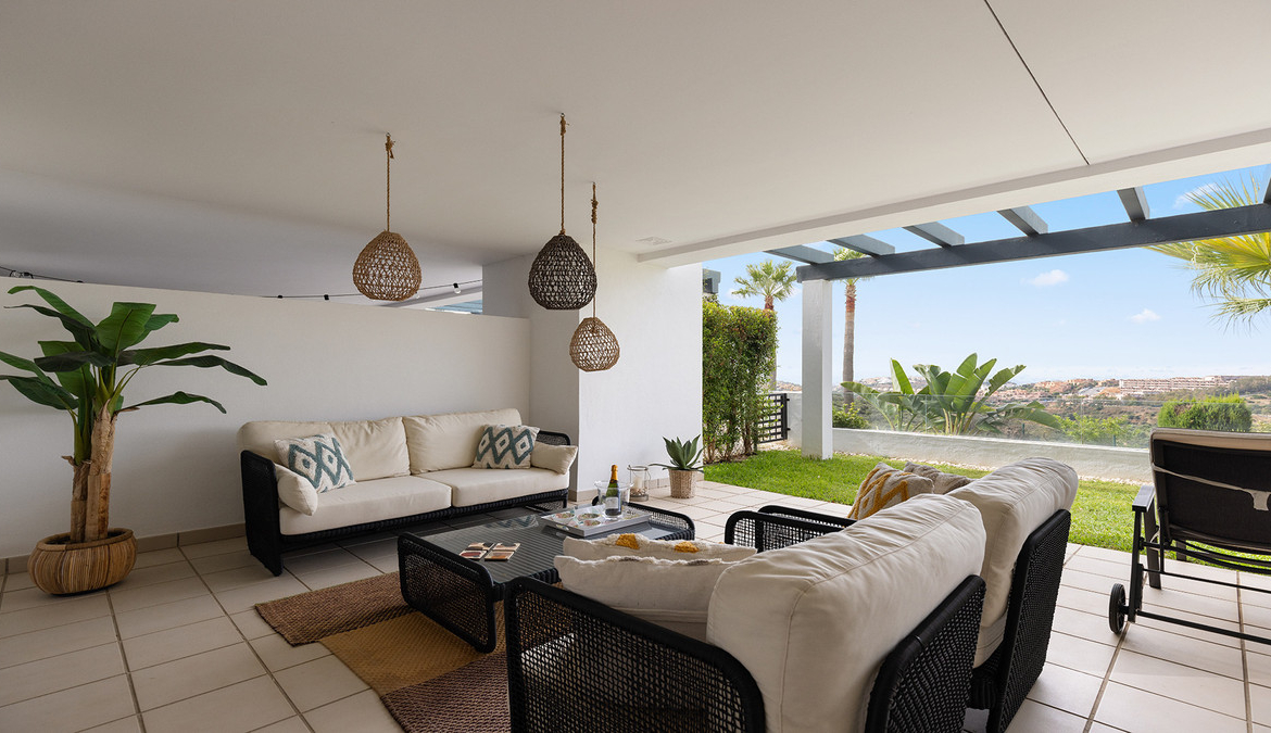 The living area flows seamlessly onto the apartment’s standout feature: a stunning terrace and garden. Partly covered, this outdoor space is perfect for al fresco dining, relaxing in the Spanish sun, or simply enjoying the serene surroundings.