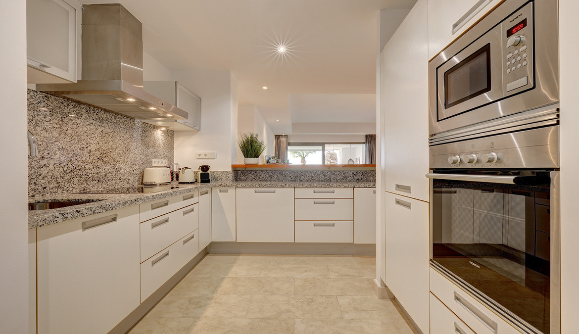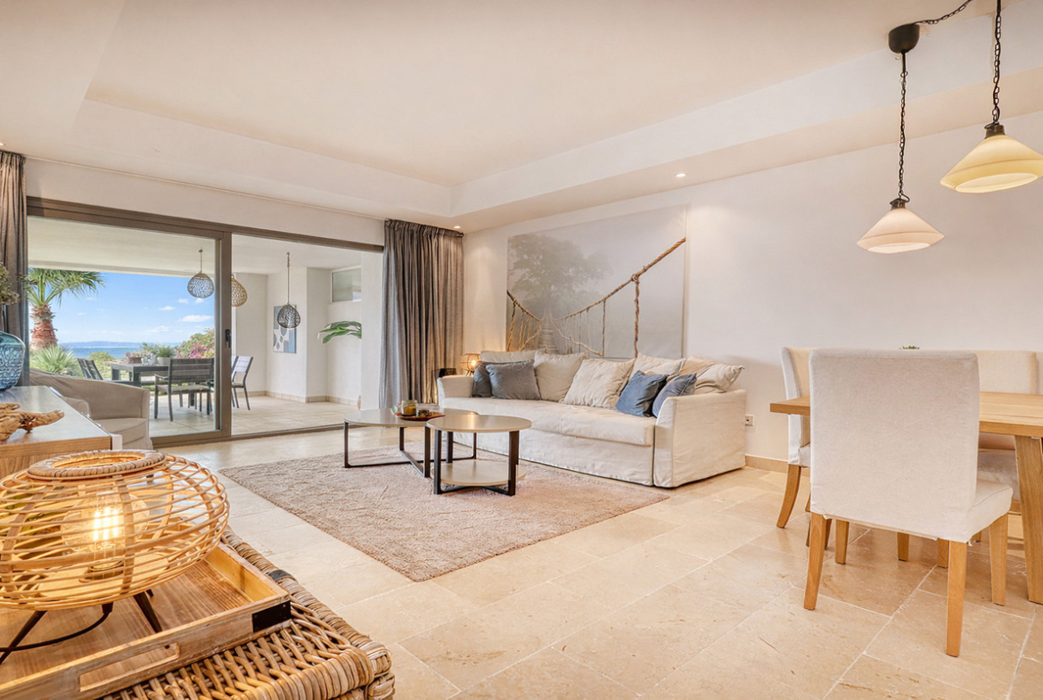 As you enter the apartment, you are greeted by a bright and airy open-plan living and dining area with breathtaking views stretching over your private garden and terrace down to the Mediterranean Sea. To the left is a timeless, fully equipped open-plan kitchen with a stylish breakfast bar – the perfect spot for morning coffee or casual meals.