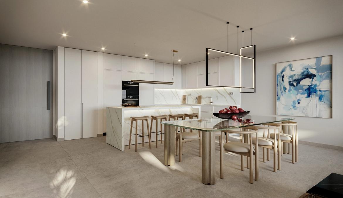 All homes feature generous interiors, contemporary finishes, and large terraces facing south or southeast, with the option of adding a Jacuzzi. Ground-floor units offer private gardens and pools, while top-floor apartments include solariums with stunning sea views and private pools.