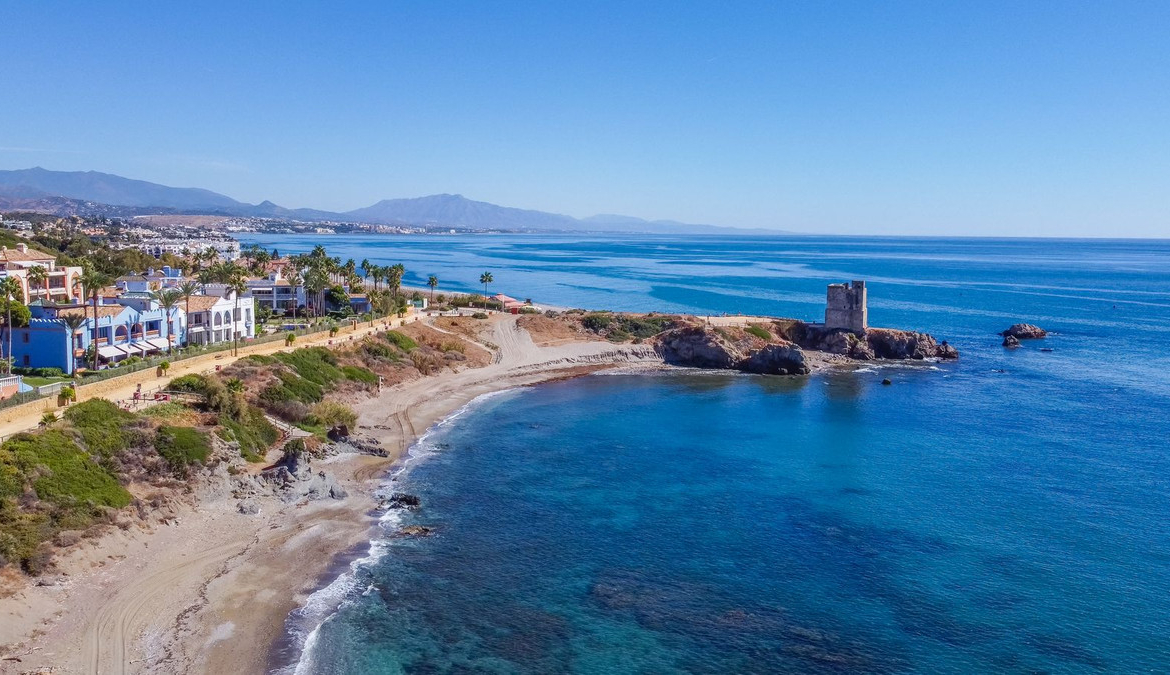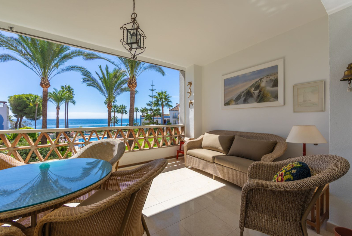 NEW ON THE MARKET: Stunning mid-floor apartment in the first line of the beach, with spectacular views of the sea, the beach, Gibraltar, and Africa, located in the exclusive Bay of Casares next to a protected historic area with an ancient Arab tower, within the prestigious La Perla de la Bahía complex featuring unique design blending Andalusian and Arab styles, surrounded by lush gardens, pools (two heated), decorative fountains, and relaxation areas; just a 2-minute walk to three beaches, two renowned restaurants, and the famous Finca Cortesín golf resort, awarded Best Golf Resort in Spain and host of the 2023 Solheim Cup; strategically located between Estepona, Puerto de la Duquesa, and Sabinillas, only 5 minutes by car, with easy access to shops, leisure, and other golf courses; gated community with 24-hour security and video surveillance; includes one garage space and a storage room; perfect both as a dream residence and an investment with high rental potential.