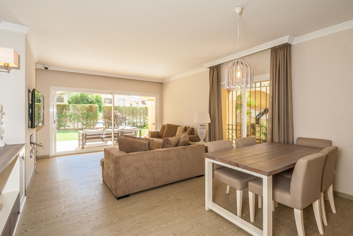Experience the charm of this unique updated ground floor apartment in Hacienda Elviria, featuring a modern open plan kitchen that seamlessly blends style and functionality. Surrounded by mature gardens, this property offers direct access to the largest of four inviting pools, perfect for relaxation and leisure. Enjoy the convenience of a short, easy walk to all local amenities and the stunning beach, making it an ideal retreat for both relaxation and recreation.