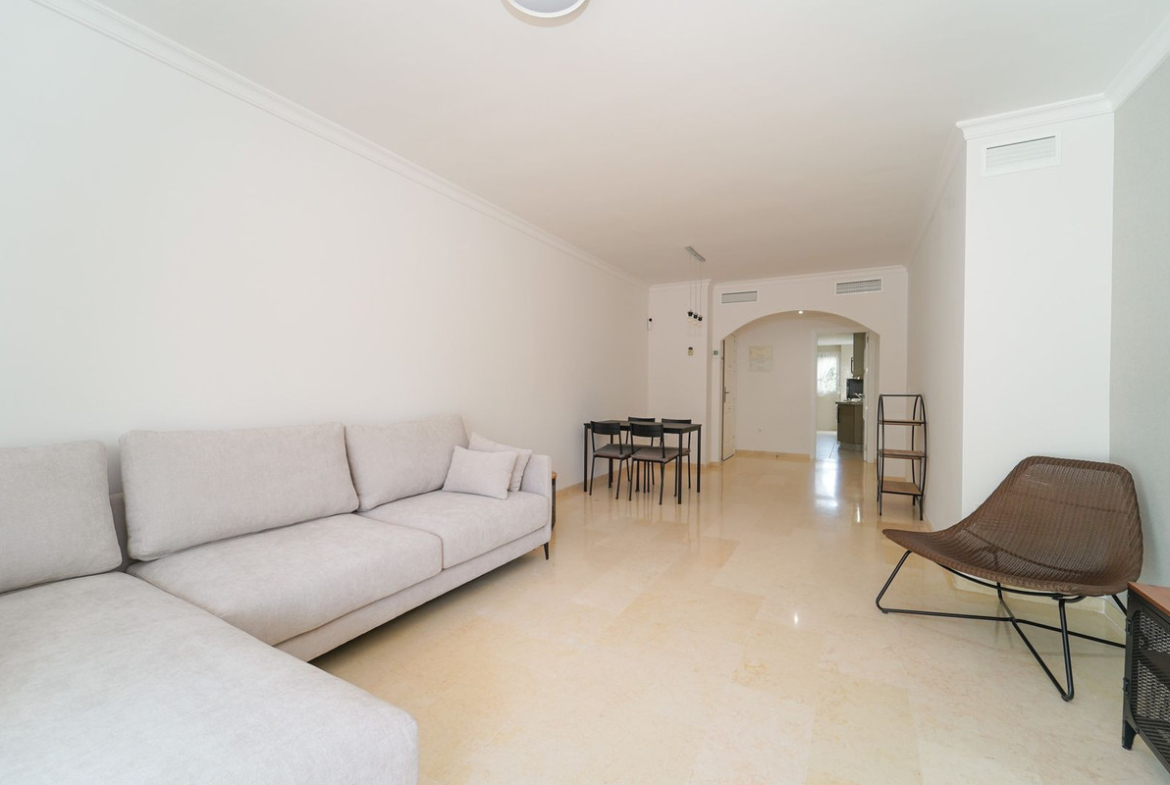 Bright and recently renovated 123 m² penthouse in the quiet area of Elviria, Marbella. The property offers two large bedrooms, two spacious bathrooms, a bright living area, fully equipped kitchen, and a private terrace with side sea and forest views. Features include window blinds and an electric awning. Located in a well-maintained complex with six swimming pools and lush gardens. Includes underground parking. Sold furnished.