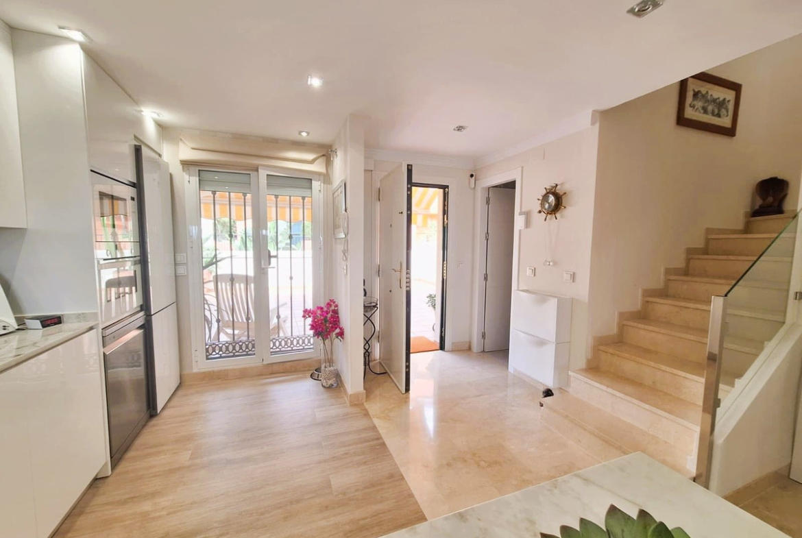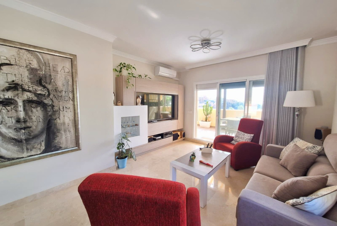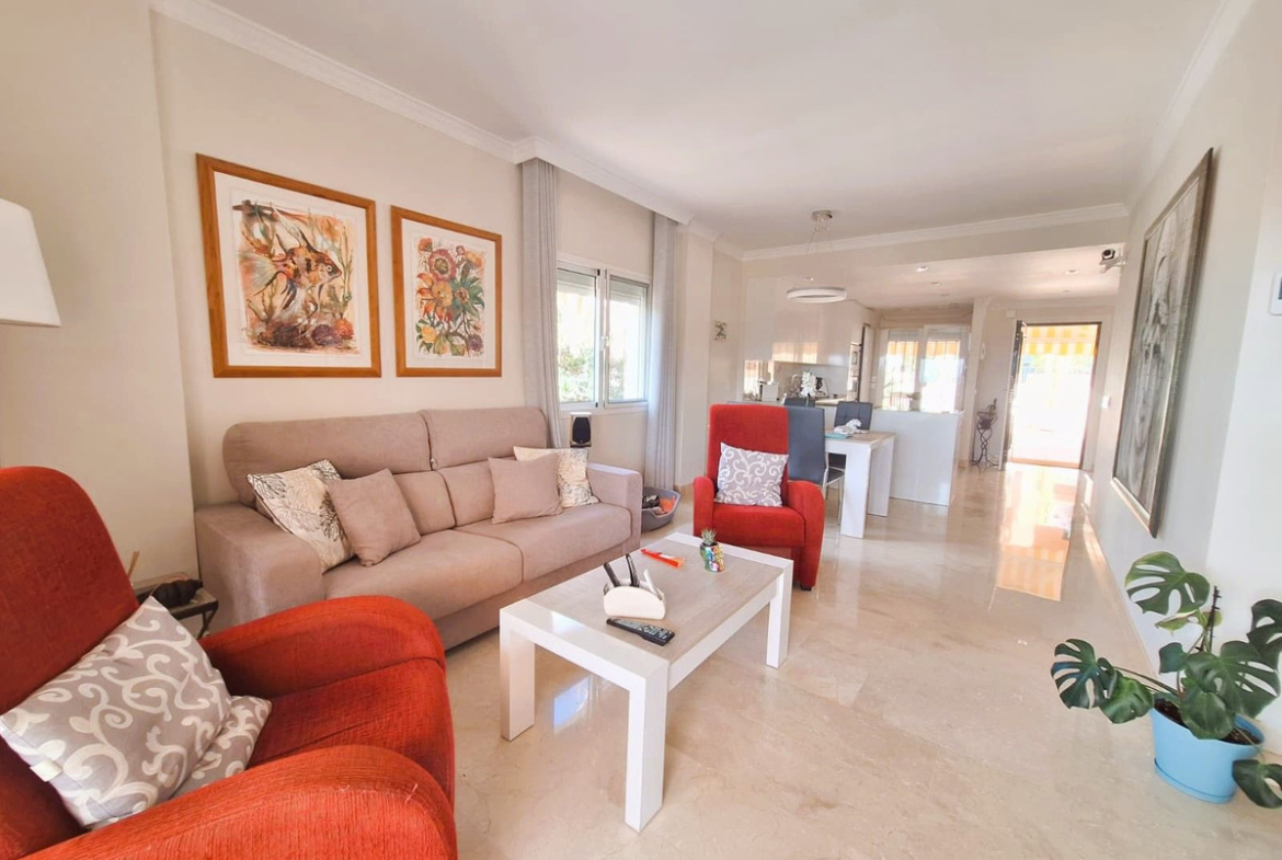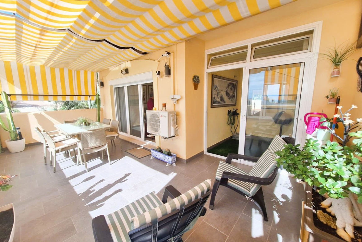 Beautiful property for sale in perfect condition in the Elviria area, close to the golf course and less than a 5-minute drive to the beach! Quiet, very residential urbanisation, ideal for permanent residence. Duplex , is on the ground level but with hight , no lift or stairs, very comfortable!!! The property is on a corner, so it is very sunny and bright and has sun all day long! Very large terrace at the entrance of the house, with awnings and afternoon sun. Upon entering, we find a spacious living room with an open, fully equipped kitchen, from the living room access to the second terrace, which faces south and offers open views of the sea, with sun all day long! There are also new awnings!