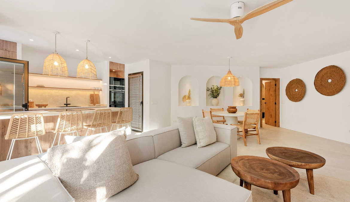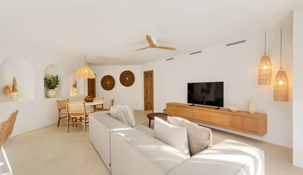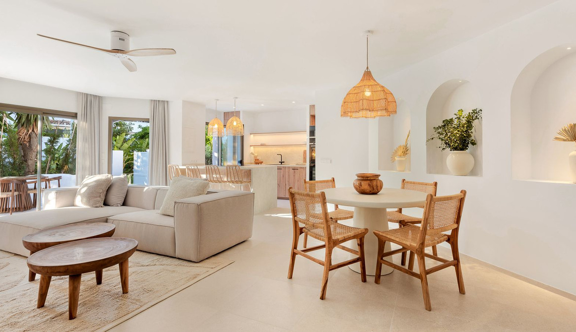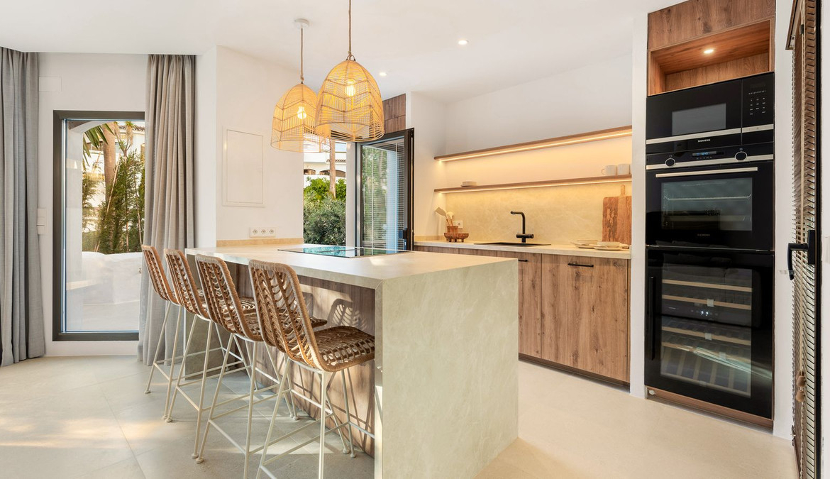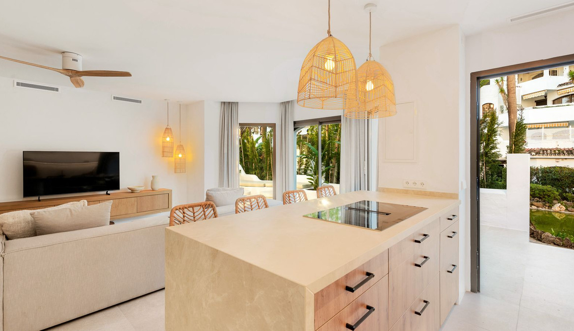 Located within the exclusive beachfront residential enclave of Golden Beach in Elviria, this fully refurbished ground-floor apartment offers the true lifestyle of modern Mediterranean living. Facing west, it enjoys beautiful sunsets, creating a warm and welcoming atmosphere both inside and out on the terrace.