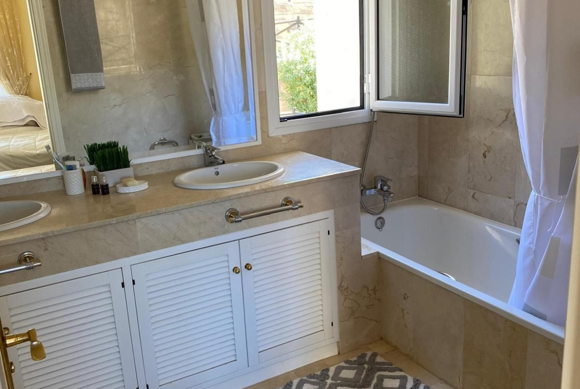 On the lower level, there is a spacious living-dining room with a fireplace and a fully equipped kitchen, with direct access to a large terrace with sea and mountain views.