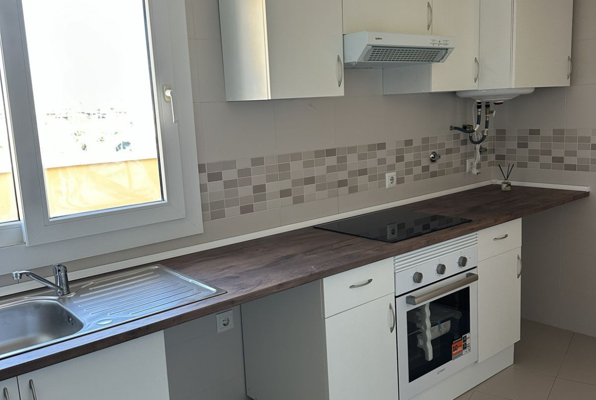 The property features two bright bedrooms, one bathroom, and a spacious living room with direct access to the terrace, creating a light and airy living space. The kitchen is fully equipped with new cabinetry and a practical, functional layout with good storage.