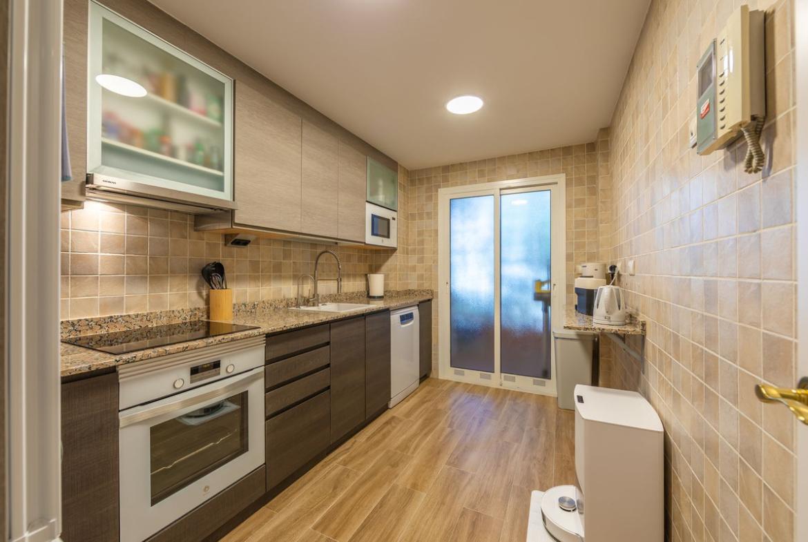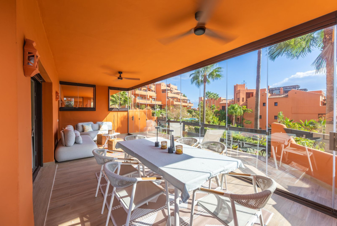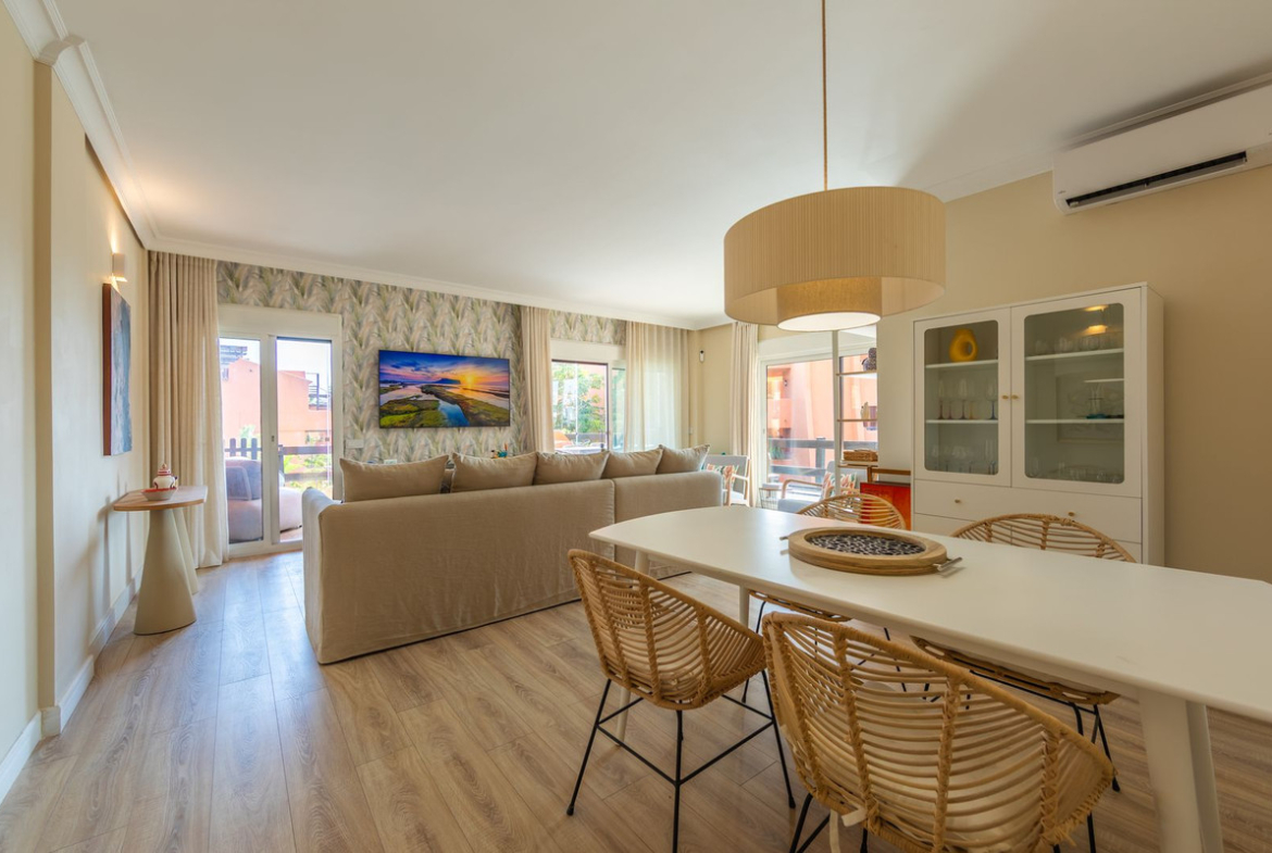 GROUND-FLOOR APARTMENT WITH LARGE TERRACE AND TOURIST LICENSE NEAR THE SEA. Privileged location in a charming Mediterranean-style complex, just 200 m from the beach and only a 5-minute drive from Estepona and the vibrant Duquesa Marina, where you’ll find all kinds of services, restaurants, and leisure options. This beautiful ground-floor apartment stands out for its brightness, thanks to its southeast orientation, and for its magnificent newly renovated terrace, featuring glass curtains, an outdoor kitchen area, and elegant parquet flooring that adds warmth and style.