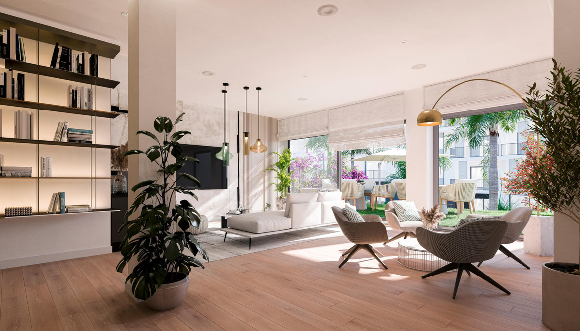 This development consists of 102 apartments and penthouses of 1, 2 and 3 bedrooms, with constructed areas of up to 102.75 m2, terraces of up to 97.36 m2 and gardens on the ground floor of up to 52.03 m2. It is a residential complex with the highest standards of architecture, energy saving and sustainability, which also has privileged common areas such as its gardens, its two swimming pools, the children’s play area, the barbecue area or the coworking space. All units include underground parking and some of the units will also have a storage room.
