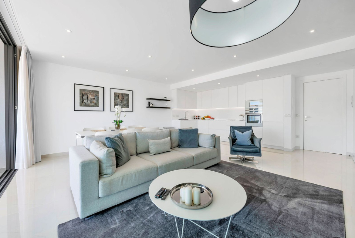 With 91 m² of elegant interior space and an impressive 81 m² terrace, this home is designed for the Mediterranean lifestyle. The spacious open-plan kitchen and living area connect seamlessly to the expansive terrace through floor-to-ceiling sliding glass doors, creating a light-filled environment perfect for both entertaining and relaxation.